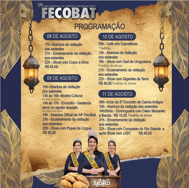 Em 2024, a Fecobat acontece de 8 a 11 de agosto, nos pavilhões de eventos da Prefeitura Municipal. Veja abaixo a programação geral: