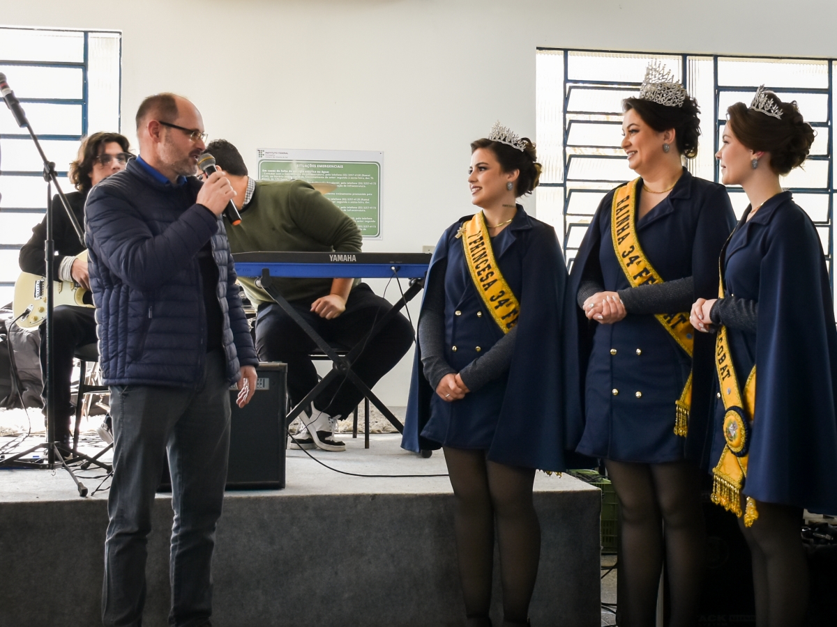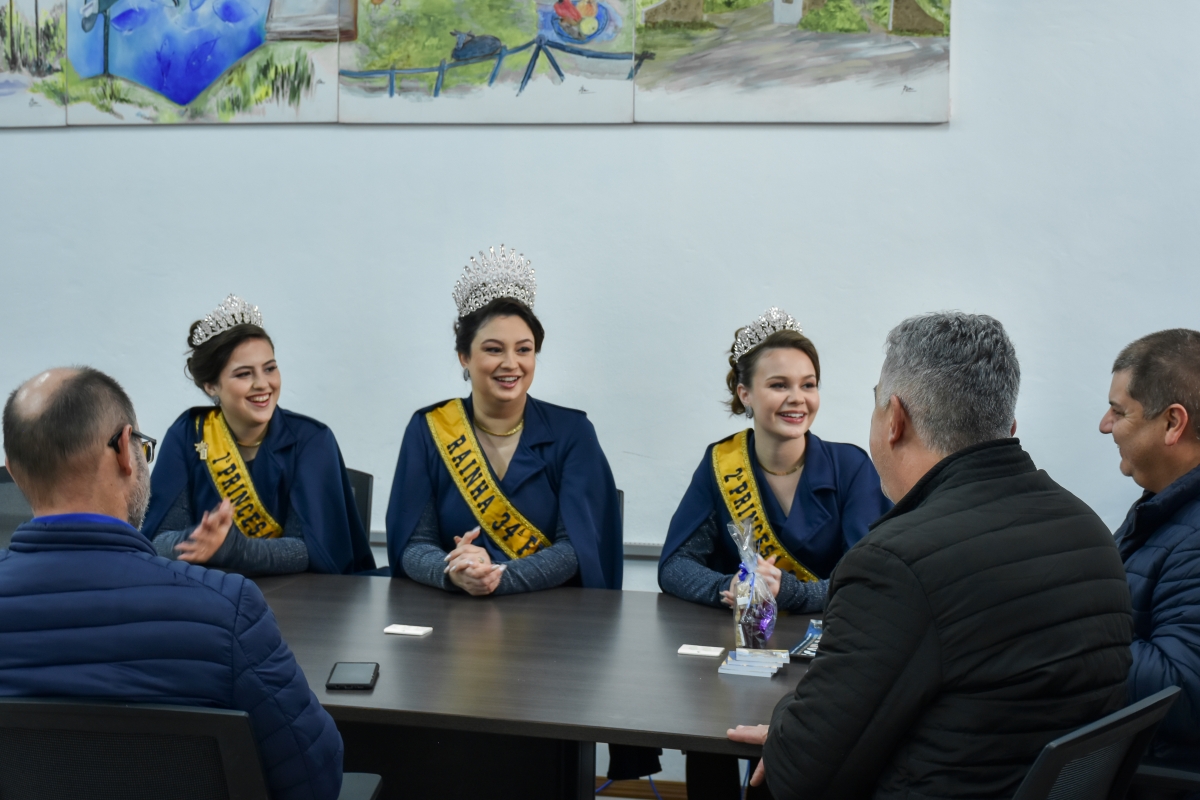 As soberanas foram recebidas pelo prof. Deivid Buttinger Dutra de Oliveira, diretor geral; prof. Paulo Roberto Cecconi Deon, diretor de Desenvolvimento Institucional; e Fabiano Damasceno, diretor de Pesquisa, Extensão e Produção.