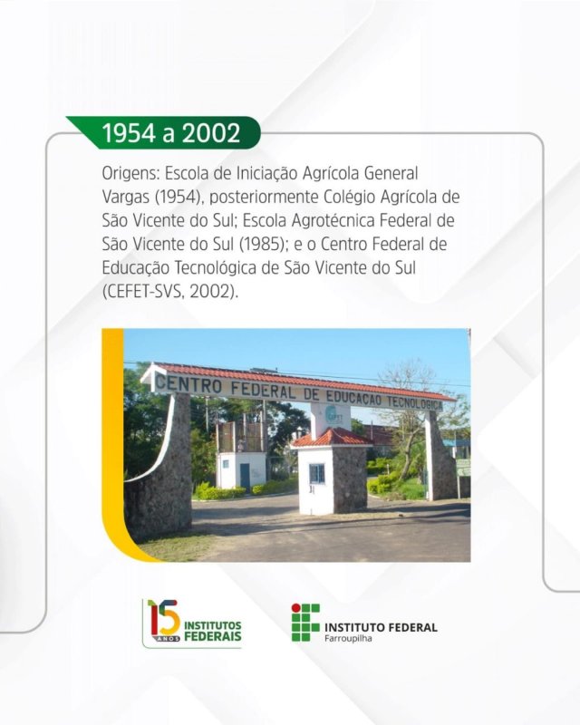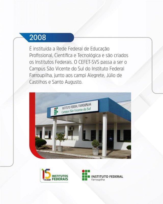 Em 2008, a Lei nº 11.892, de 29 de dezembro de 2008, criou os Institutos Federais de Educação Ciência e Tecnologia e a Portaria MEC n° 4, de 06 de janeiro de 2009, estabeleceu a relação dos campi componentes do Instituto Farroupilha, onde foi inserido o Campus São Vicente do Sul.