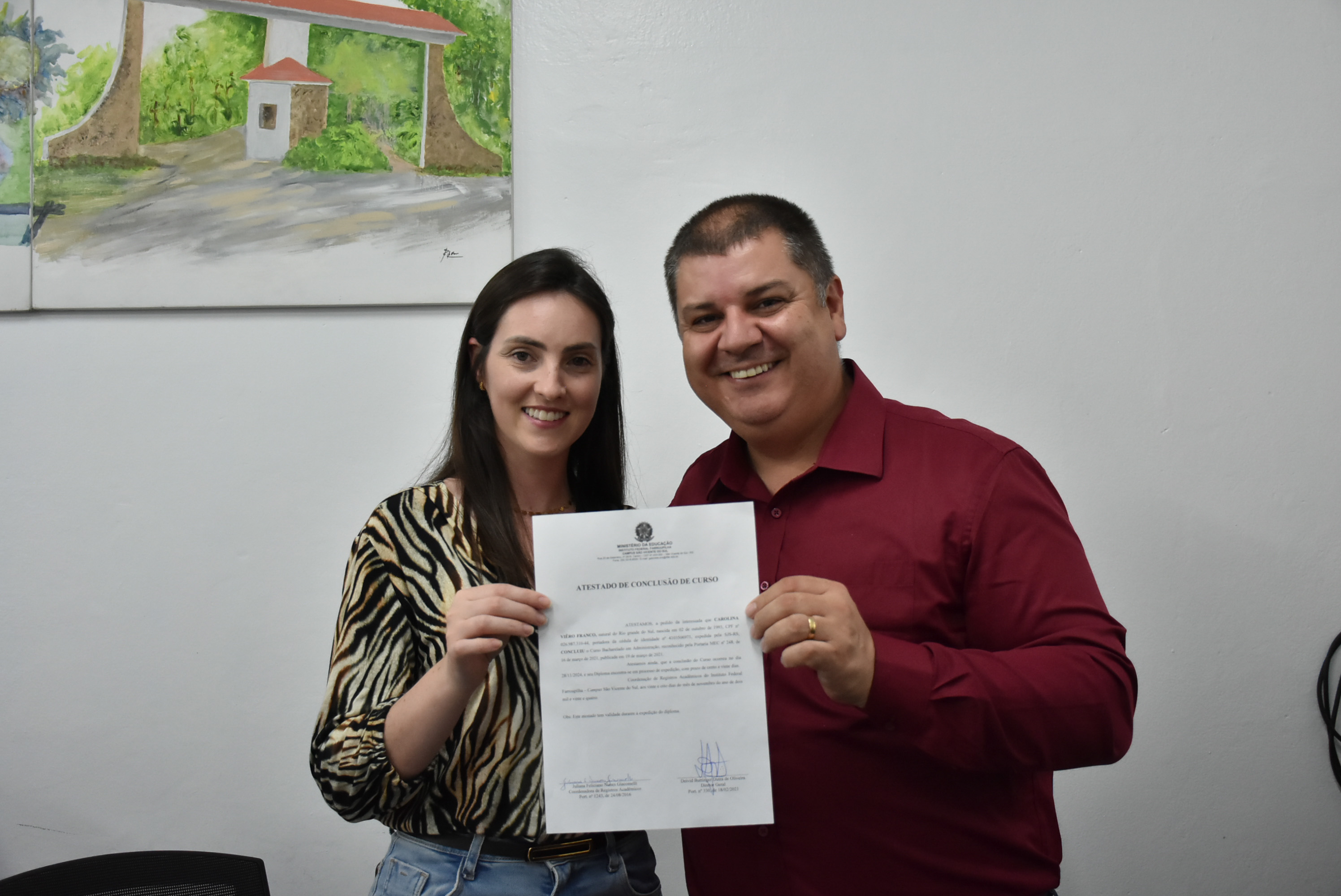 Na quinta-feira, 28 de novembro, a formanda Carolina Viêro Franco, de 31 anos e natural de Jagurai, Rio Grande do Sul, recebeu seu diploma de Bacharel em Administração pelo IFFar - Campus São Vicente do Sul, durante uma Colação de Grau em Gabinete. A cerimônia aconteceu na sala da Direção Geral e contou com a presença do Diretor Geral, Deivid Buttinger Dutra de Oliveira, da coordenadora de curso, professora Vanessa Almeida da Silva, e de seus familiares.