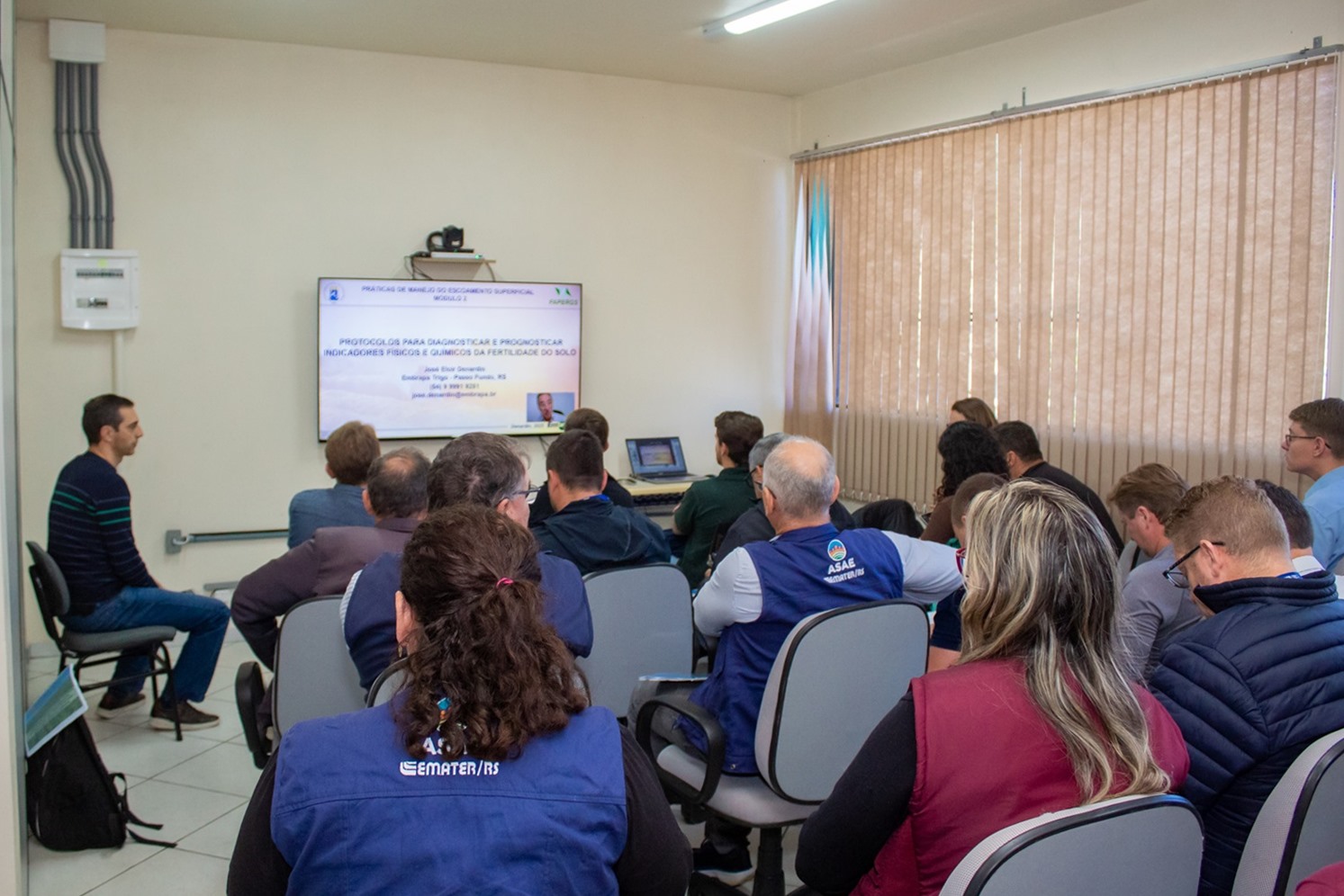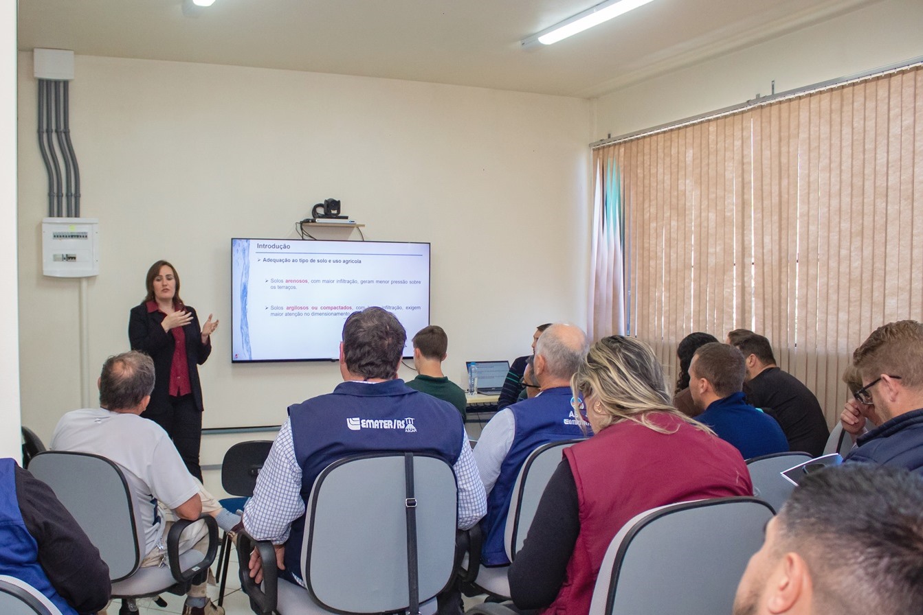 Além da apresentação dos projetos envolvidos e de algumas ações já realizadas, o curso abordou temas centrais da conservação do solo e do manejo da água. A programação incluiu palestras sobre protocolos para diagnóstico de indicadores físicos e químicos de fertilidade do solo, ministrada por José Denardin (Embrapa Trigo); infiltração da água no solo, com a professora Miriam Rodrigues (UFSM); e alocação e dimensionamento de terraços agrícolas, com Jean Minella e Marta Drescher (UFSM), além do prof. Cleudson José Michelon (IFFar).