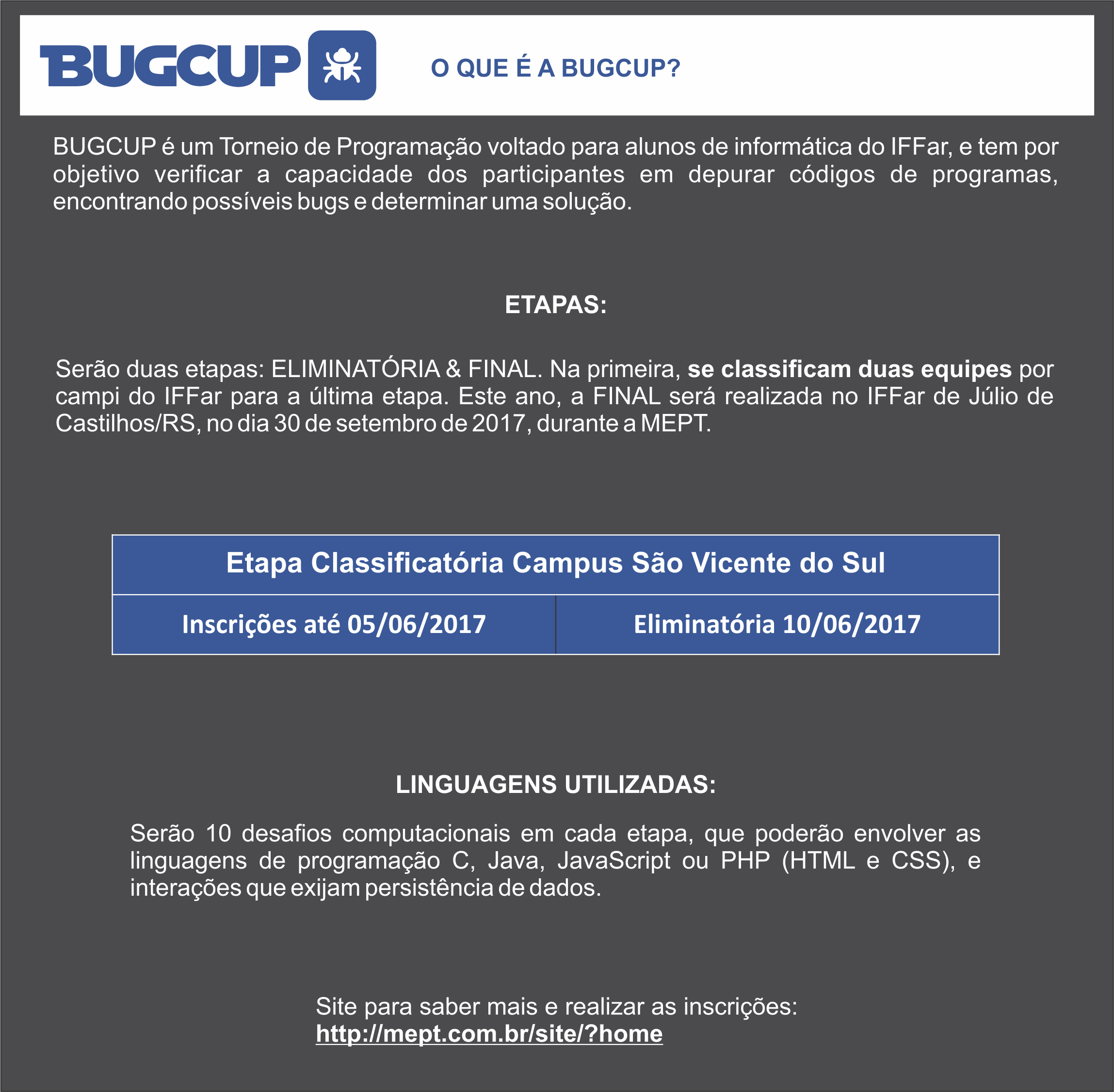 Etapa eliminatória da competição da BUGCUP que ocorrerá em 10/06/2017 e as inscrições estarão disponíveis até 05/06/2017