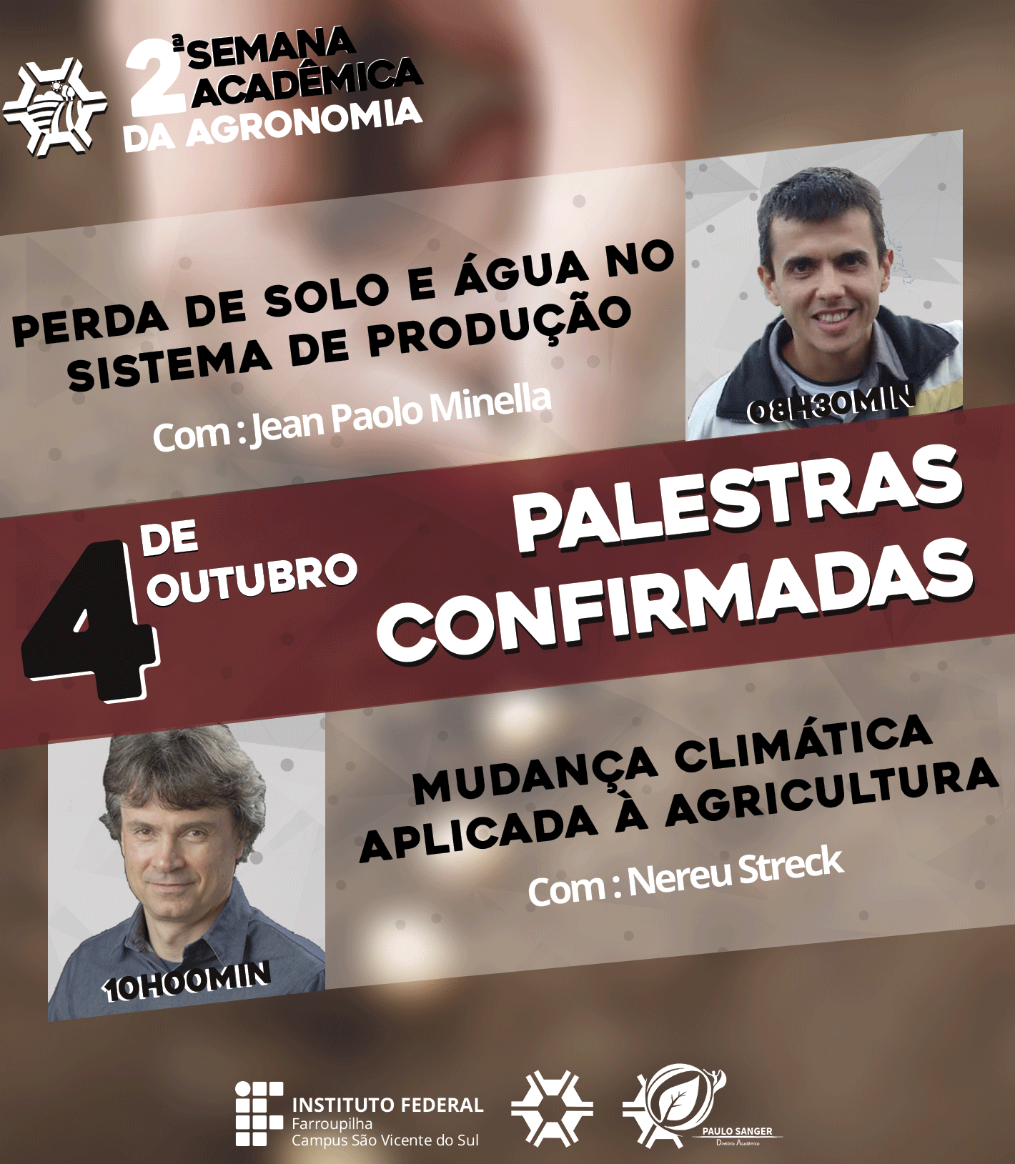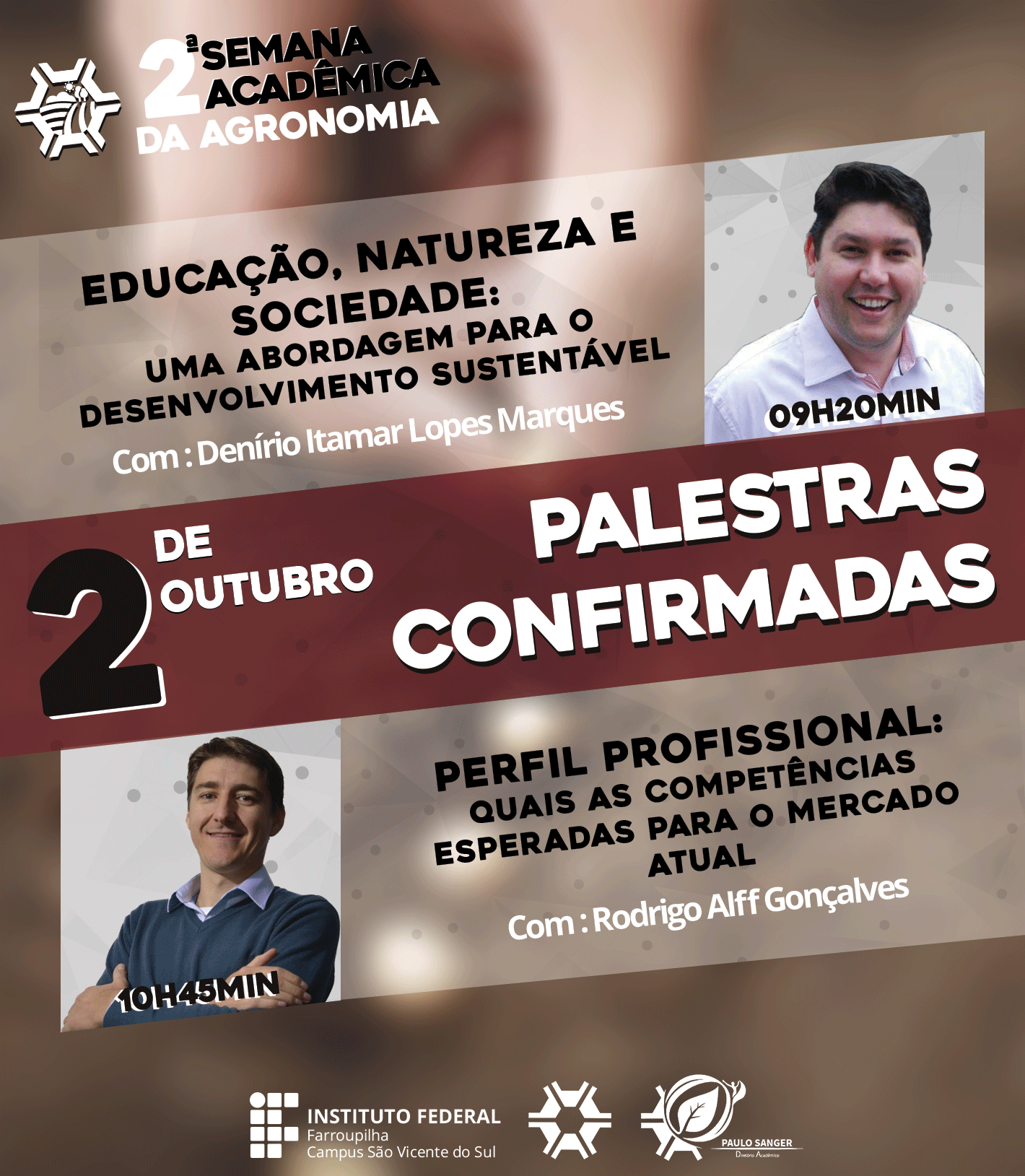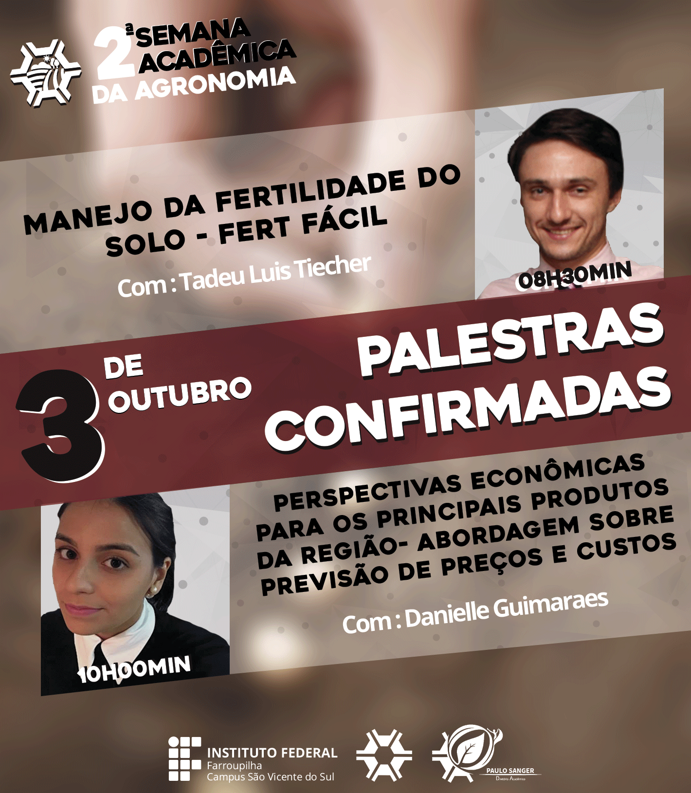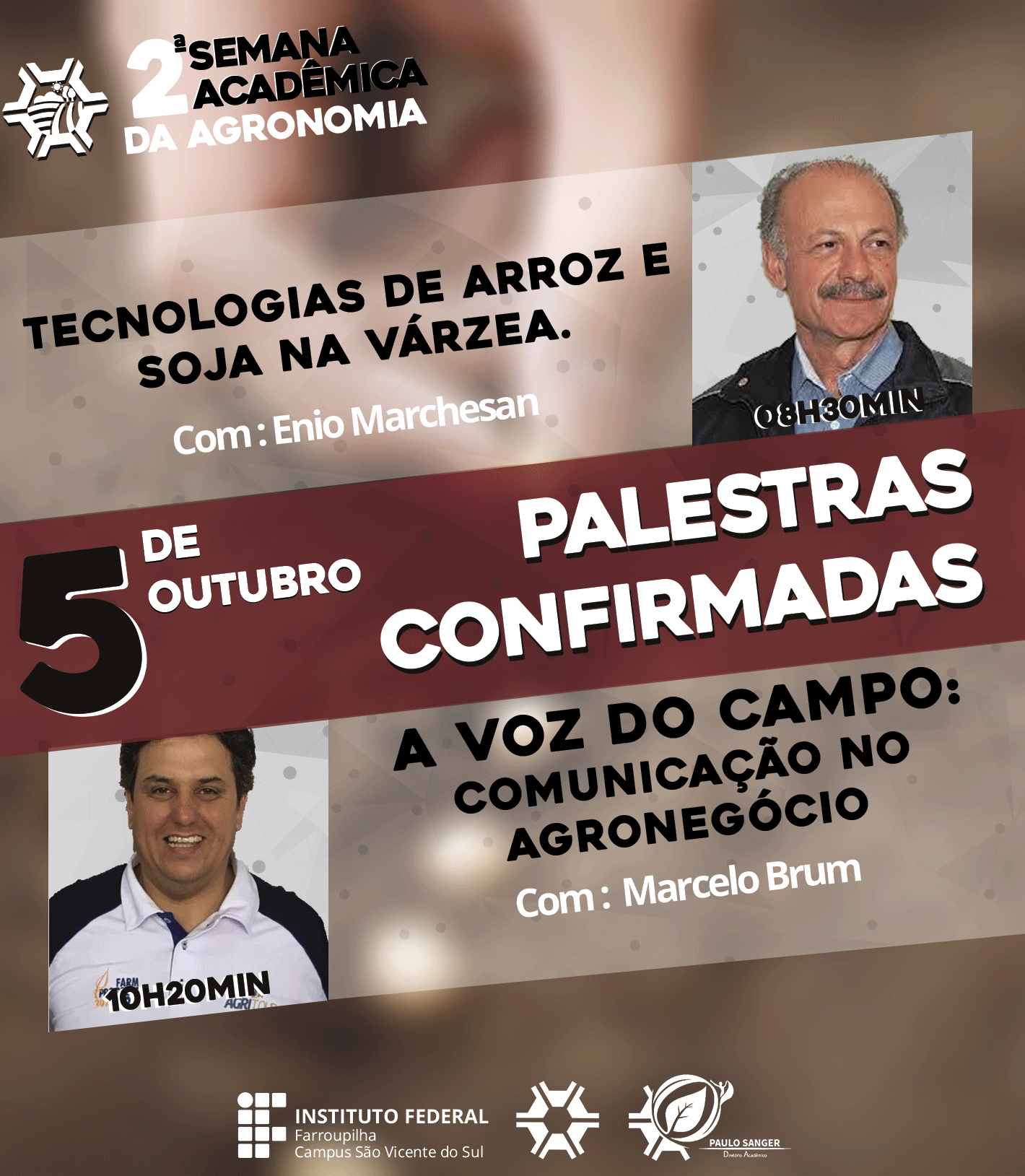 Em outubro, nos dias 2, 3, 4, 5, acontecerá no Salão azul do Instituto Federal Farroupilha campus São Vicente do Sul a 2º Semana Acadêmica da Agronomia, com tema proposto "Semeando ideias para uma nova agricultura". Onde Já podemos verificar qual será a programação.