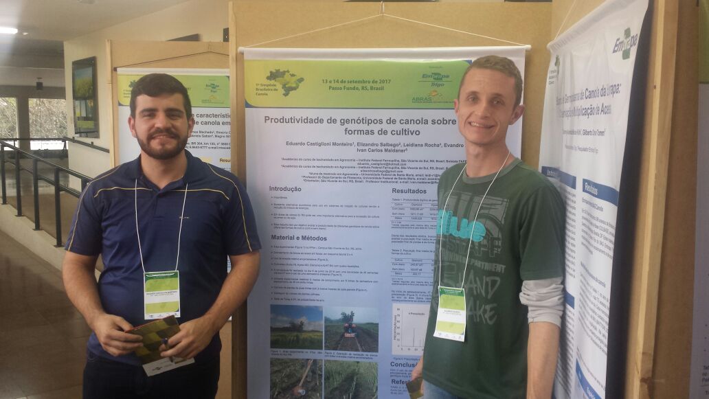 Nos dias 13 e 14 de setembro de 2017, o servidor Ivan Carlos Maldaner juntamente com os alunos Elizandro Salbego e Eduardo Monteiro do curso de Agronomia do Instituto Federal Farroupilha Campus São Vicente do Sul participaram do 1° Simpósio Brasileiro de Canola. No evento foram discutidas futuras pesquisas para incrementar a produção de canola no Brasil. Também foram apresentados dois resumos referentes ao projeto em parceria com a Embrapa Trigo e Universidade Federal de Santa Maria pelos estudantes sobre a cultura da canola.