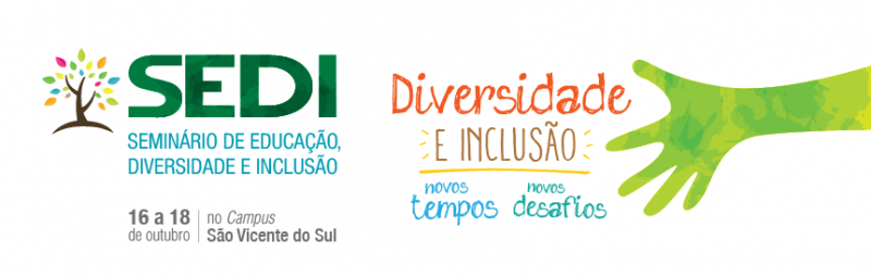 Nos dias 16 a 18 de outubro, o Campus São Vicente do Sul será sede do Seminário de Educação, Diversidade e Inclusão (SEDI). O objetivo do seminário é oportunizar espaços de reflexão, formação e discussão sobre os novos tempos e desafios da realidade educacional brasileira, no que tange à inclusão e à diversidade.