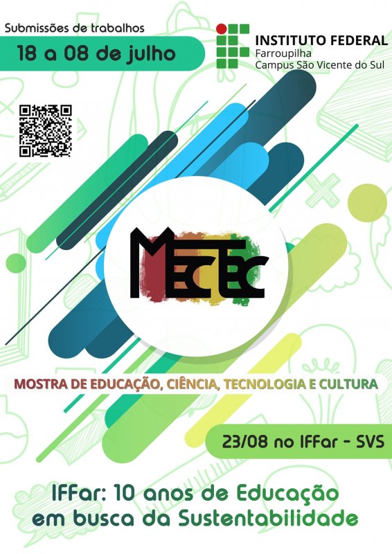 O prazo para submissão de trabalhos para a Mostra de Educação, Ciência e Tecnologia (MECTeC) do Campus São Vicente do Sul vai até dia 8 de julho. O Regulamento do evento pode ser encontrado no site oficial, onde também poderão ser realizadas as inscrições para o evento. As modalidades de participação são: ouvinte, apresentação oral, em pôster e artístico-cultural.