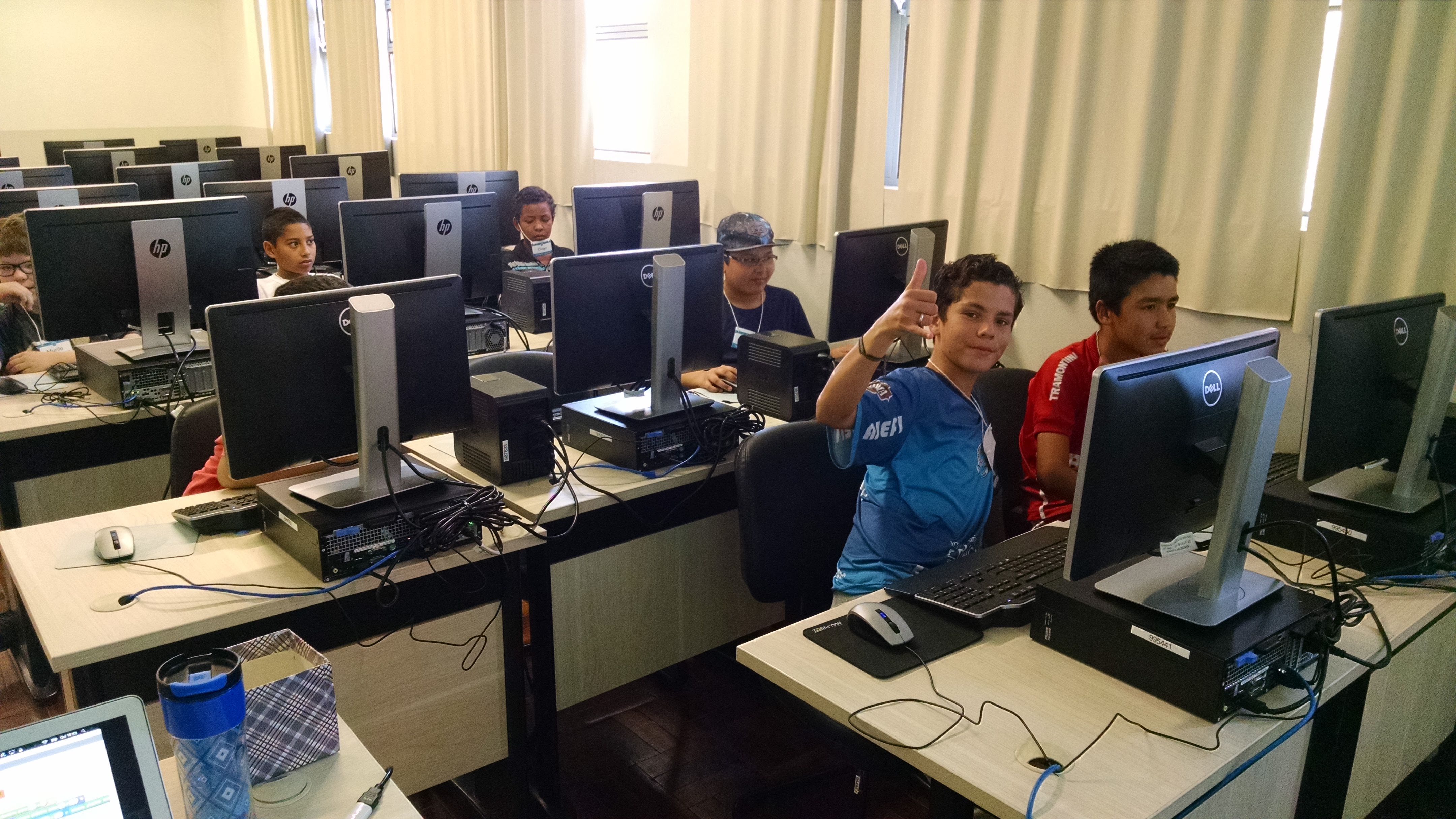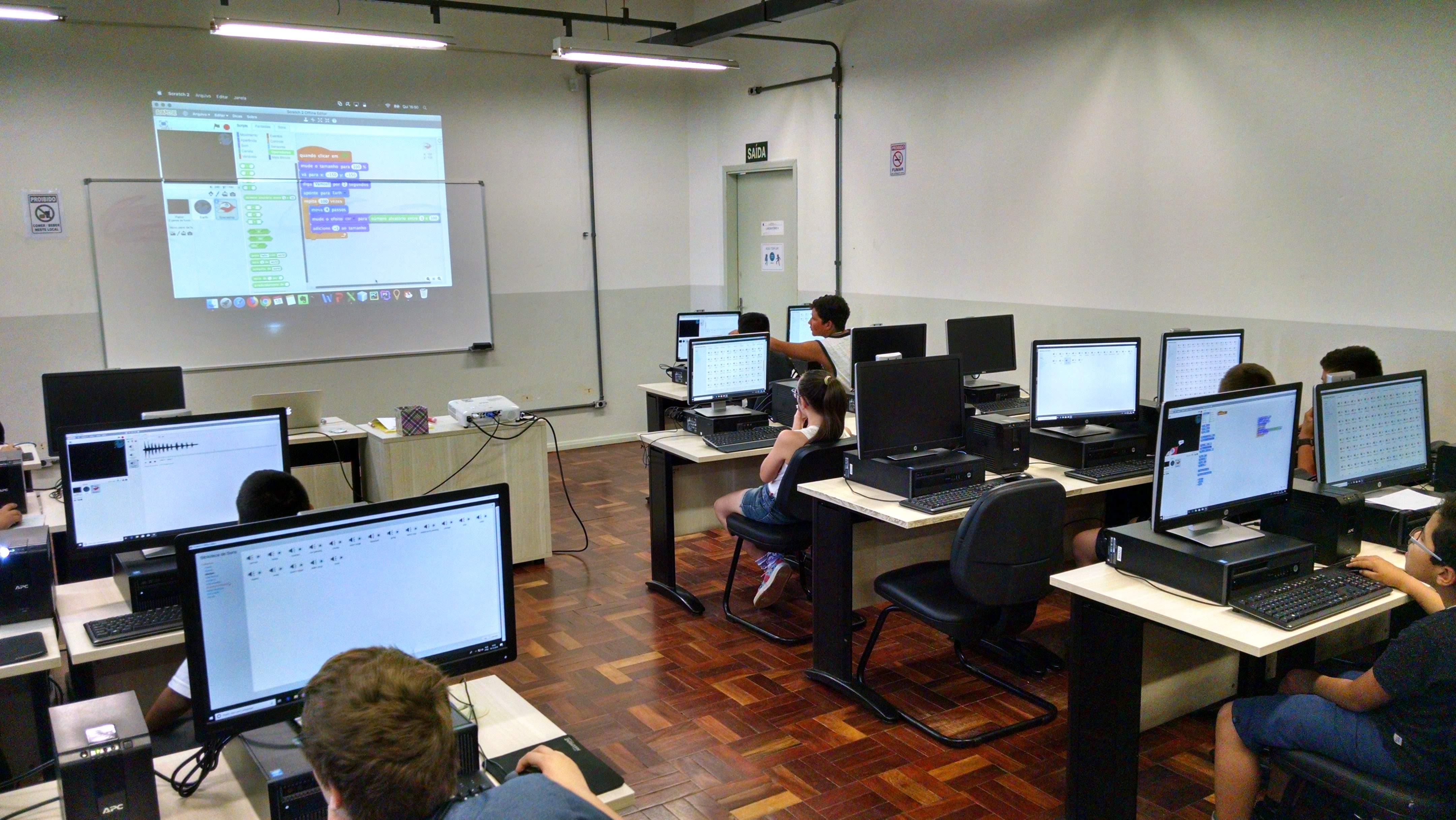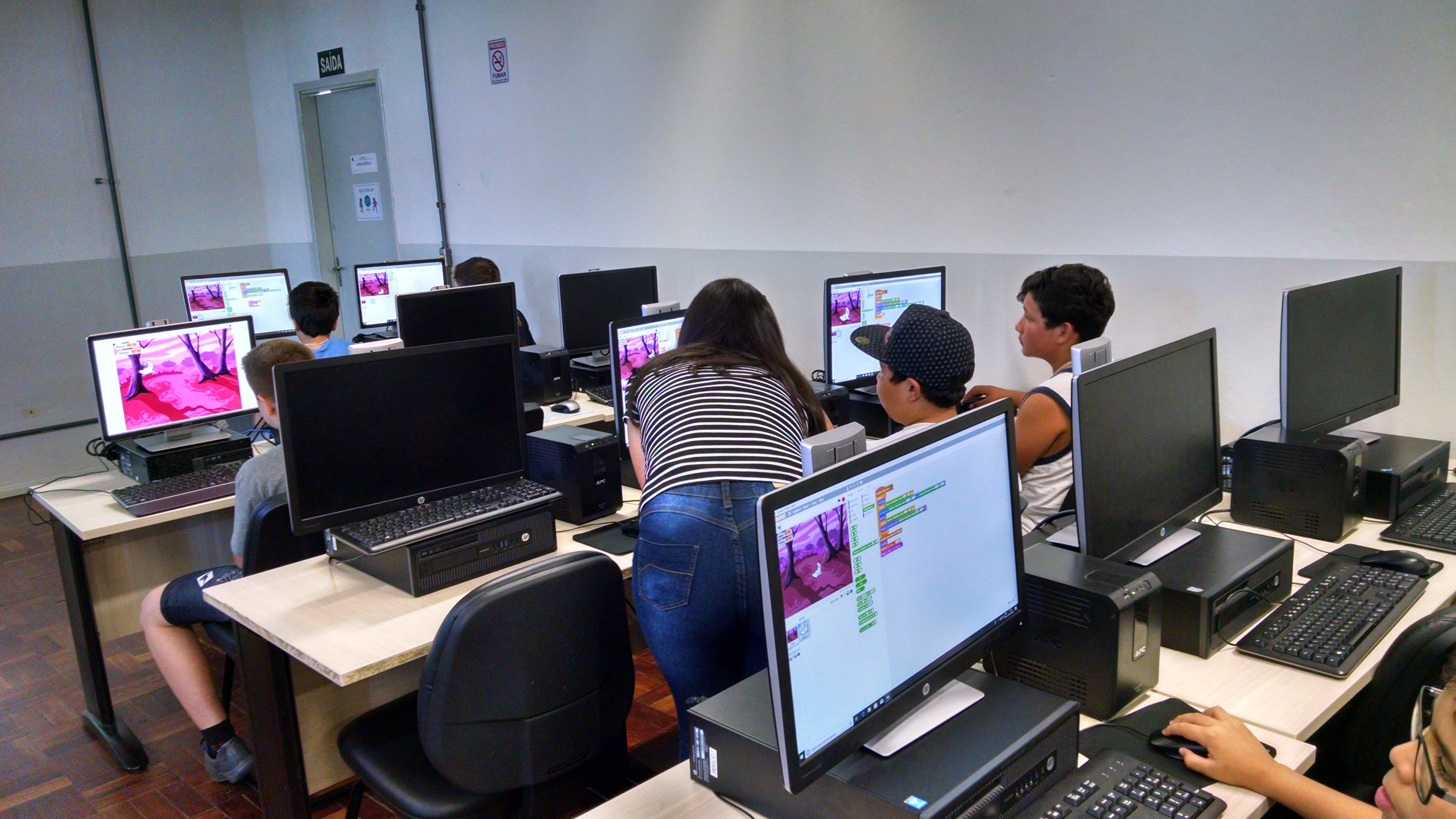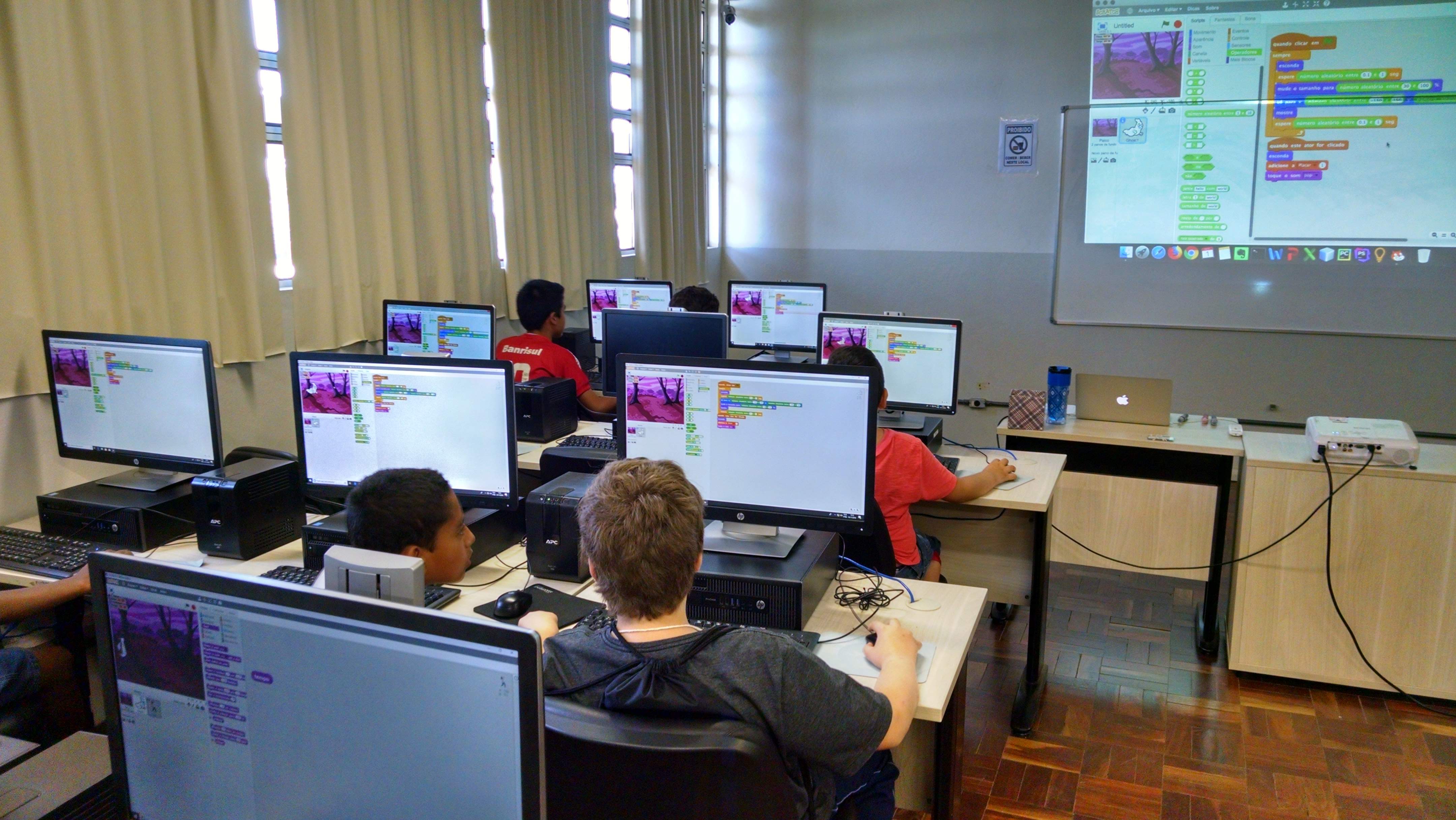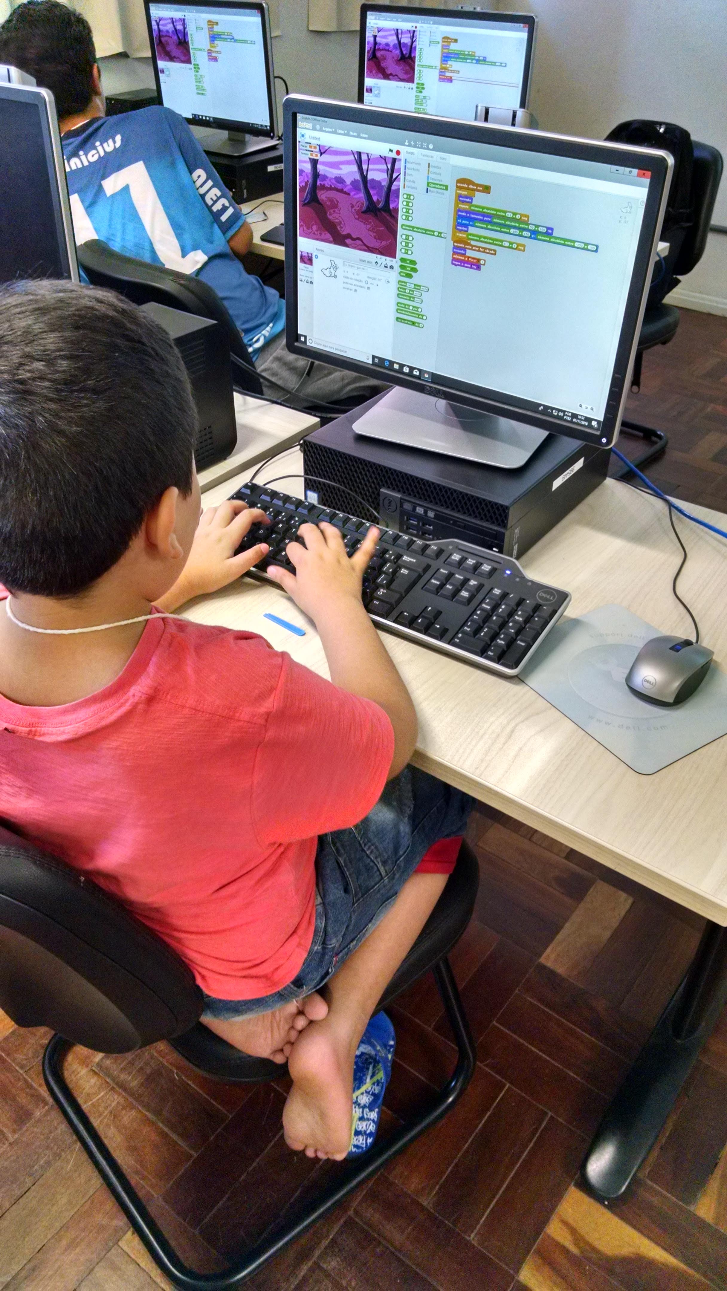 As crianças aprenderam conceitos de lógica de programação por meio de jogos e animações usando o programa Scratch, onde em vez de digitar inúmeras linhas de código em uma linguagem de programação enigmática utiliza-se blocos de comandos coloridos para programar.