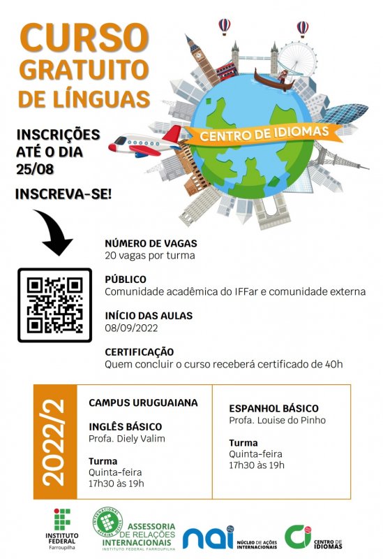 Estão abertas as inscrições para os cursos gratuitos de inglês e espanhol. A seleção será feita por sorteio. As aulas começam no dia 08 de setembro. Vagas para alunos, servidores e público externo.