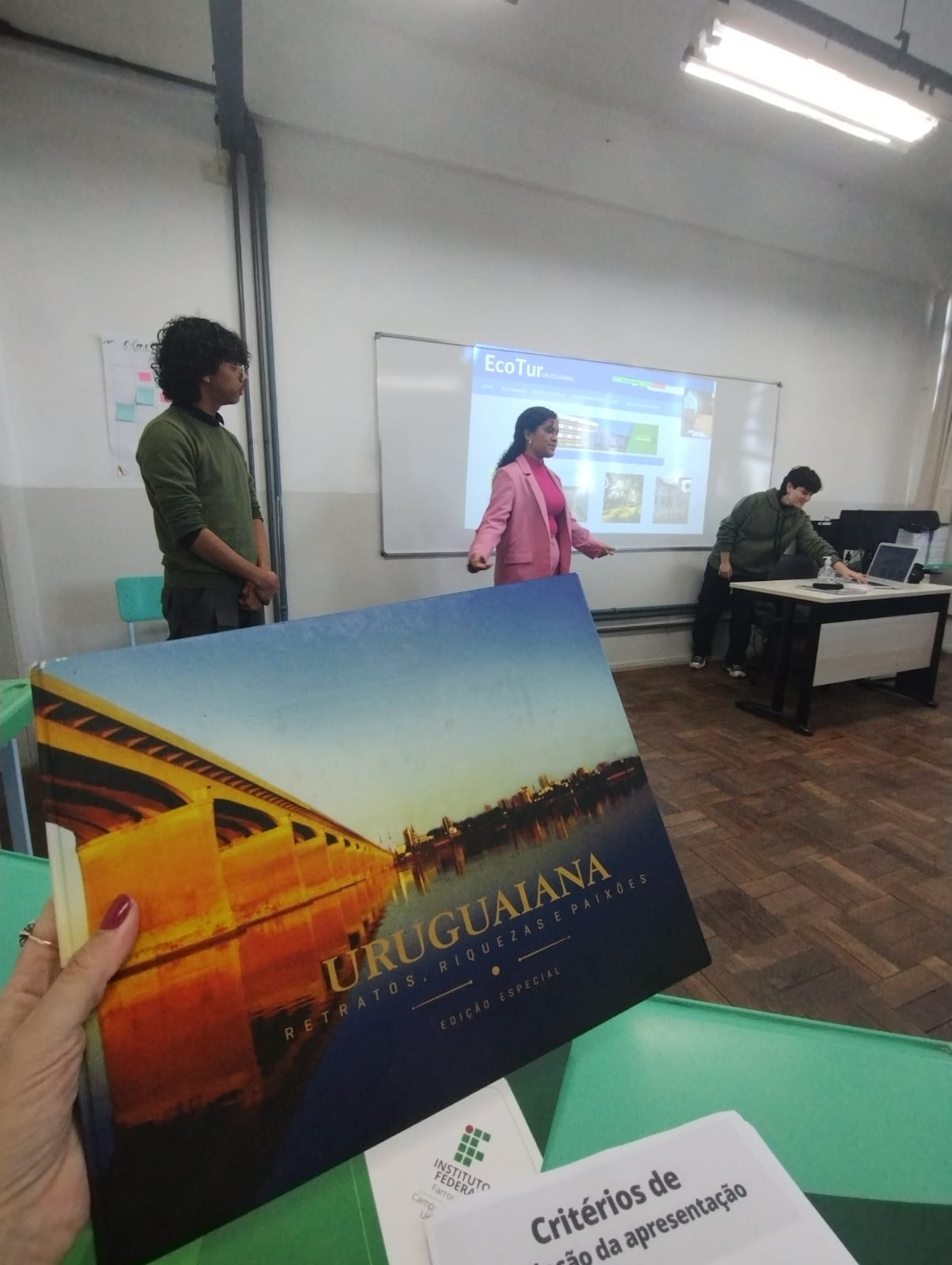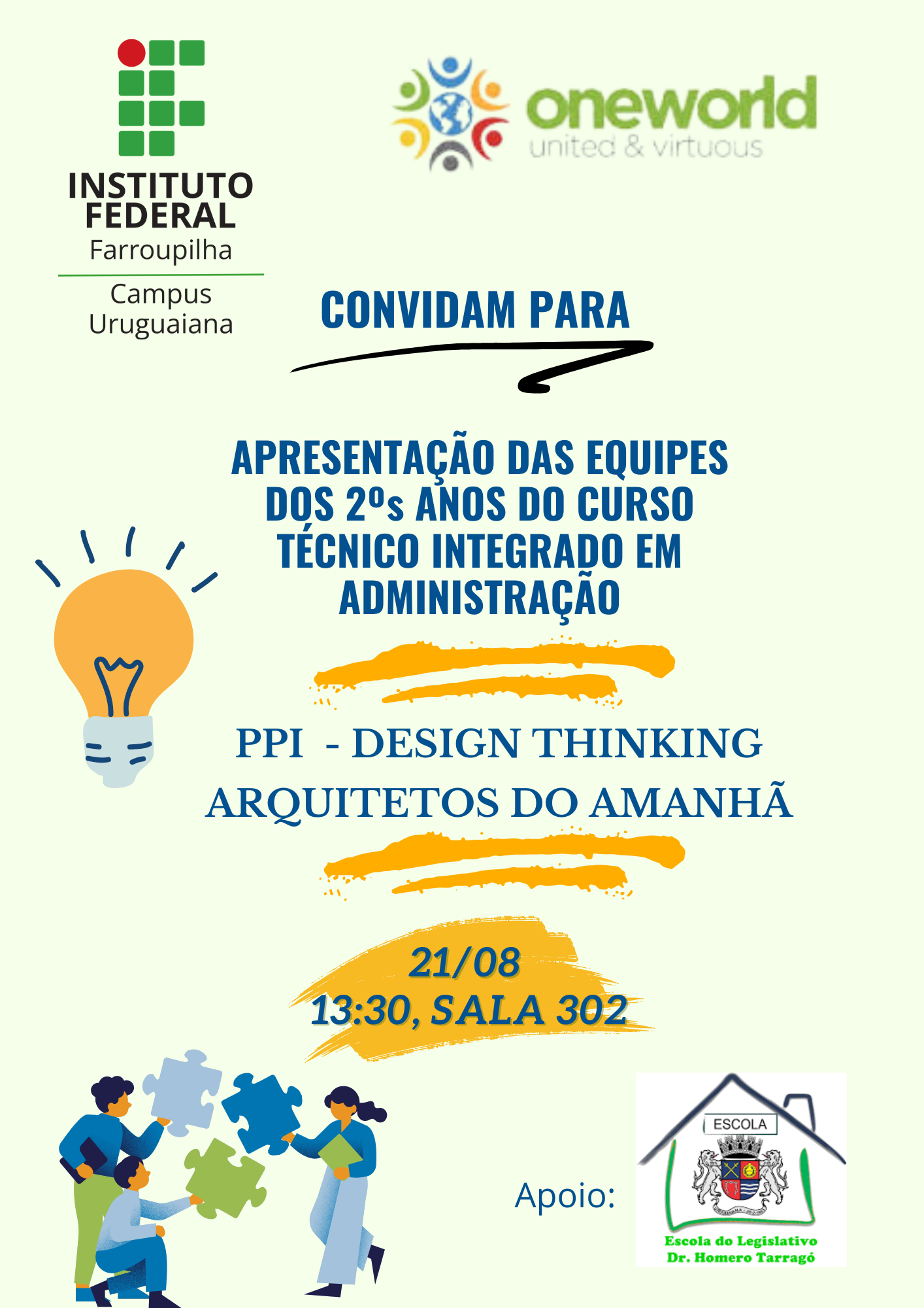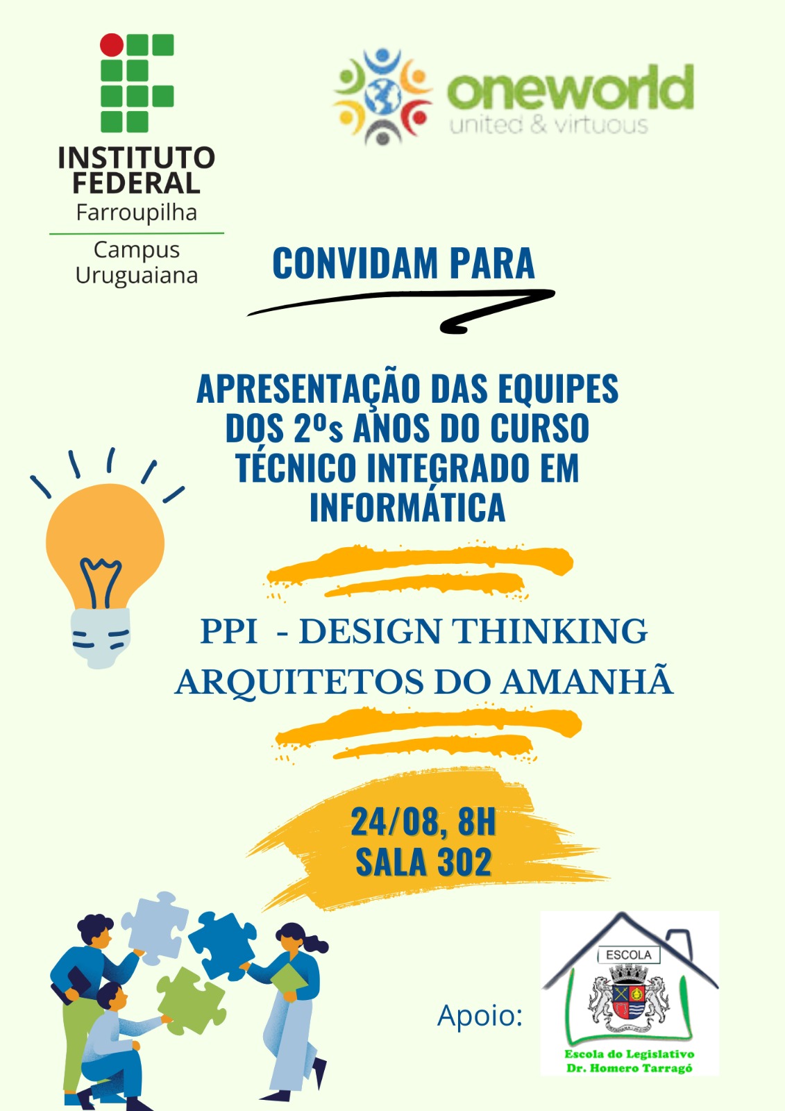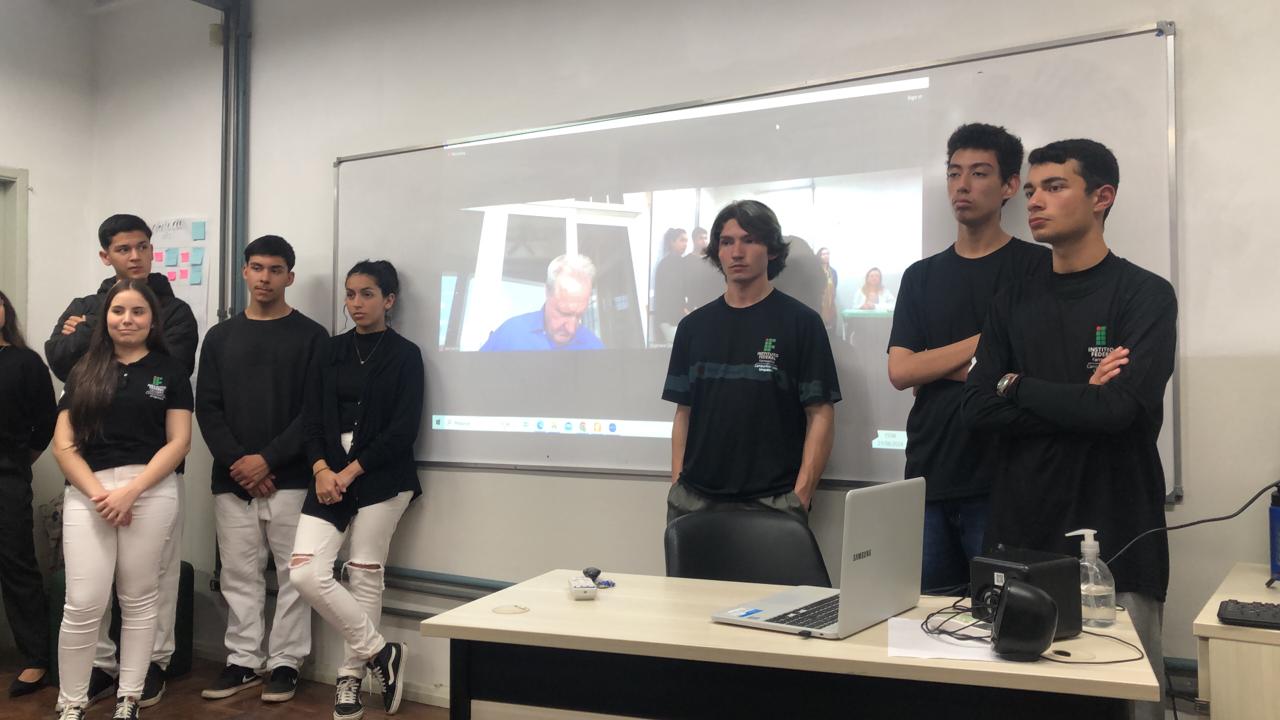 A Prática Profissional Integrada Internacional "Design Thinking - Arquitetos do Amanhã" é resultado de uma parceria com a One World United & Virtuous 🌎 (EUA), a Escola do Legislativo de Uruguaiana e a Associação de Catadores de Lixo Amigos da Natureza (ACLAN - Uruguaiana), e foi desenvolvida com as turmas de segundos anos dos nossos cursos técnicos integrados em Administração e Informática do campus Uruguaiana, por um coletivo de docentes e envolvendo os Núcleos de Ações Internacionais (NAI) e de Gestão Ambiental (NUGEA). Ao final do trabalho, que durou de fevereiro a agosto, os estudantes apresentaram as soluções locais desenvolvidas por suas equipes para uma banca constituída pelos professores, pelo co-fundador da One World United & Virtuous Joseph Carvin (EUA), por Ricardo Simas (Diretor da Escola do Legislativo) e por Guilherme Perlin (InovMun, ecossistema de inovação de Uruguaiana). Cada equipe apresentou como sua solução responde a um problema da civilização (falta de pacificação, usos da Inteligência Artificial e problemas de sustentabilidade socioambiental), com foco na cidade de Uruguaiana. Foram apresentadas 33 soluções locais, sendo que uma delas já está pronta para uso. Trata-se de um aplicativo que traz informações sobre as rotas e horários de ônibus da cidade. Tendo em vista o contexto dessa prática profissional integrada internacional, os estudantes Arthur do Amaral Jacques, Eduardo Antunes da Silva e Samuel Alvarenga Prates, da turma INFO 22 (2º ano do Curso Técnico Integrado em Informática), buscaram trazer uma solução para a problemática do transporte público na cidade. A pesquisa de dados que eles realizaram, através de entrevistas e de ida a campo, apontou para a carência de um sistema de informação eficiente na relação população- transporte público. De modo específico, eles observaram a inexistência de um mapa virtual que traga as rotas das linhas e os horários de cada linha, prevendo os horários estimados em cada parada durante todo o trajeto. Nesse sentido, eles viram a oportunidade de criar um mapeamento das linhas com a adição de horários estimados de saída e chegada e durante o trajeto, considerando, se possível, disponibilizar um rastreamento em tempo real do veículo de transporte coletivo. O projeto pode ser acessado aqui: https://drive.google.com/file/d/1o7XoBmHJK_DMuUcfdlDf9ohE5KzRNzaY/view?usp=sharing. O texto está em inglês, como parte da PPI Internacional para a disciplina de Língua Inglesa, mas, ao final da apresentação, há um QRCode para o aplicativo, que está disponível em Língua Portuguesa.