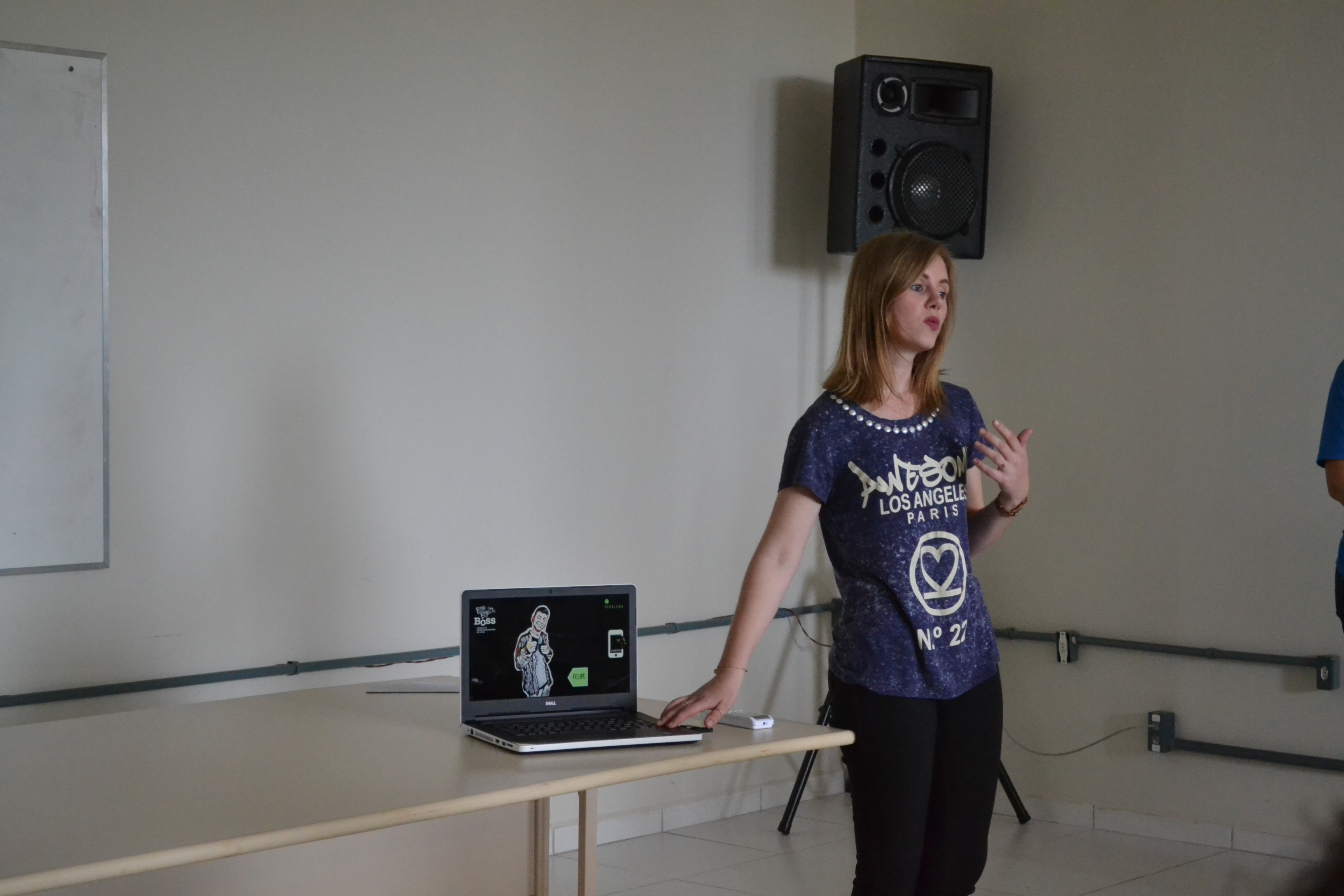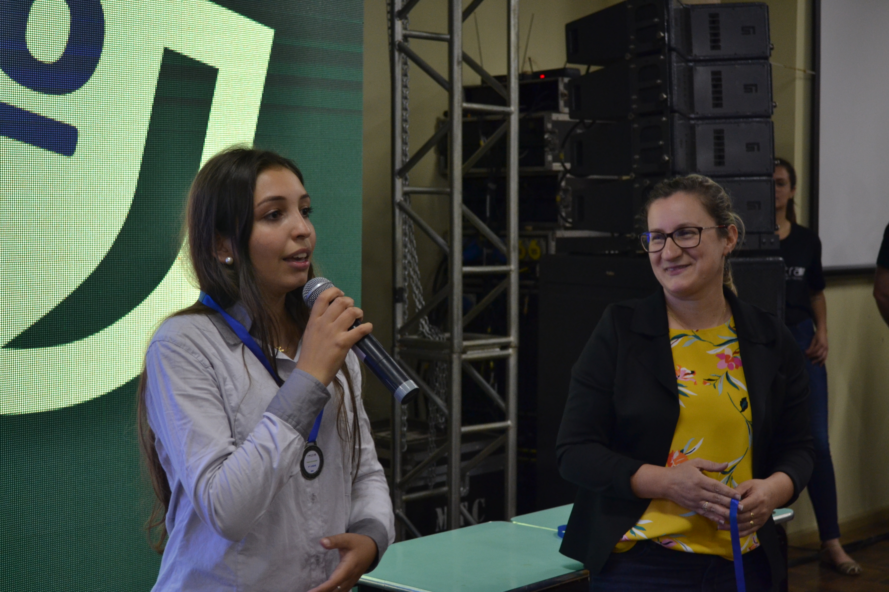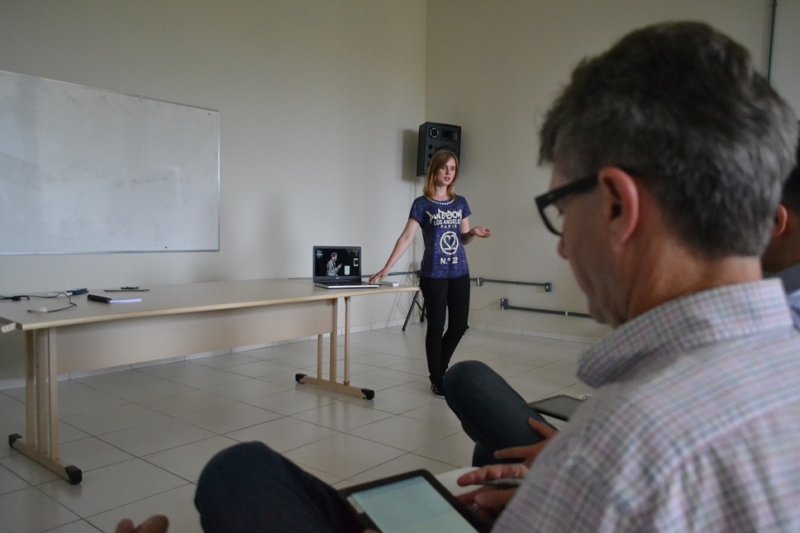 Foto: aluna do campus Santa Rosa apresenta idea sobre aplicativo de venda de plantas a empresários do estado