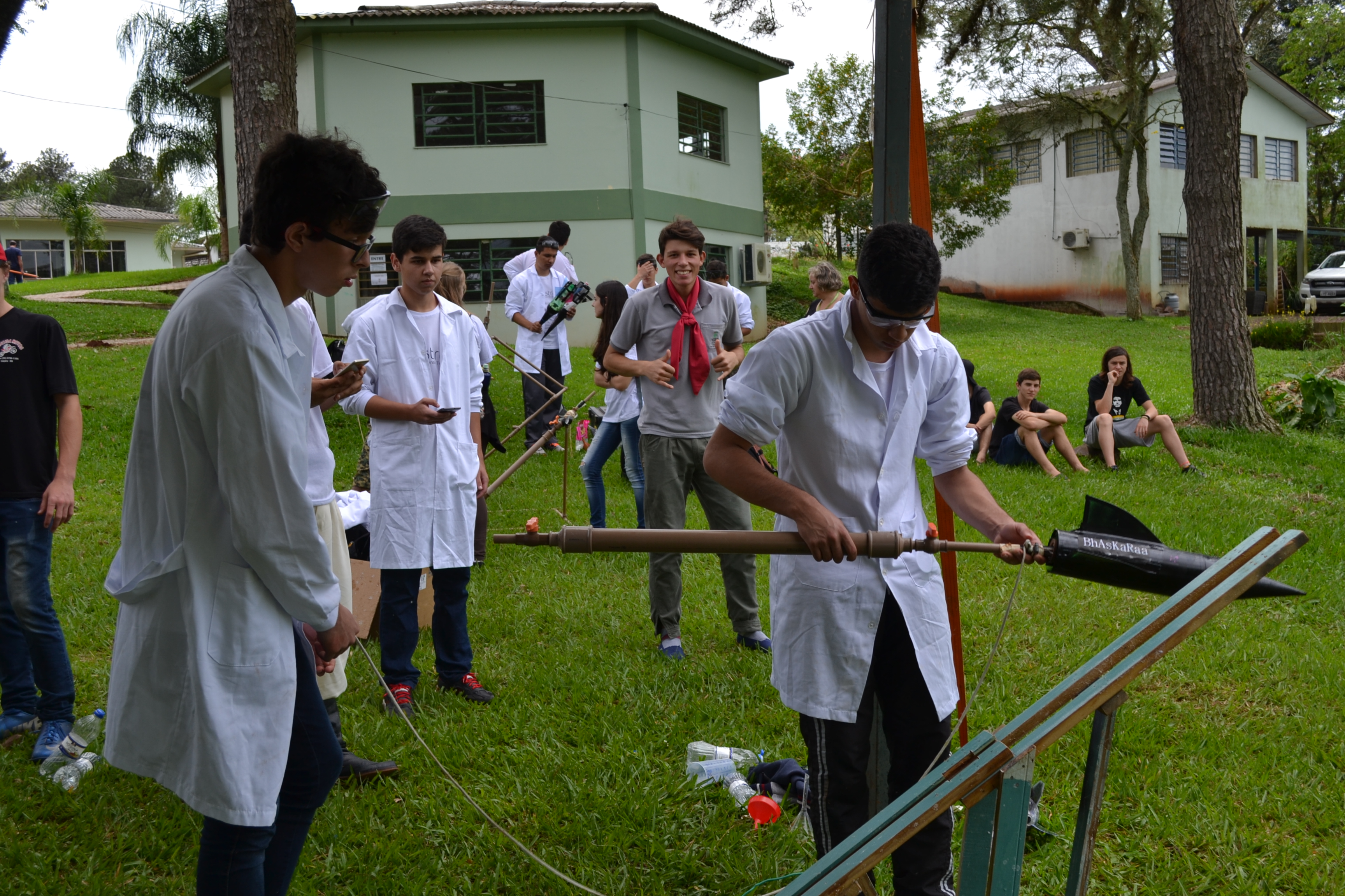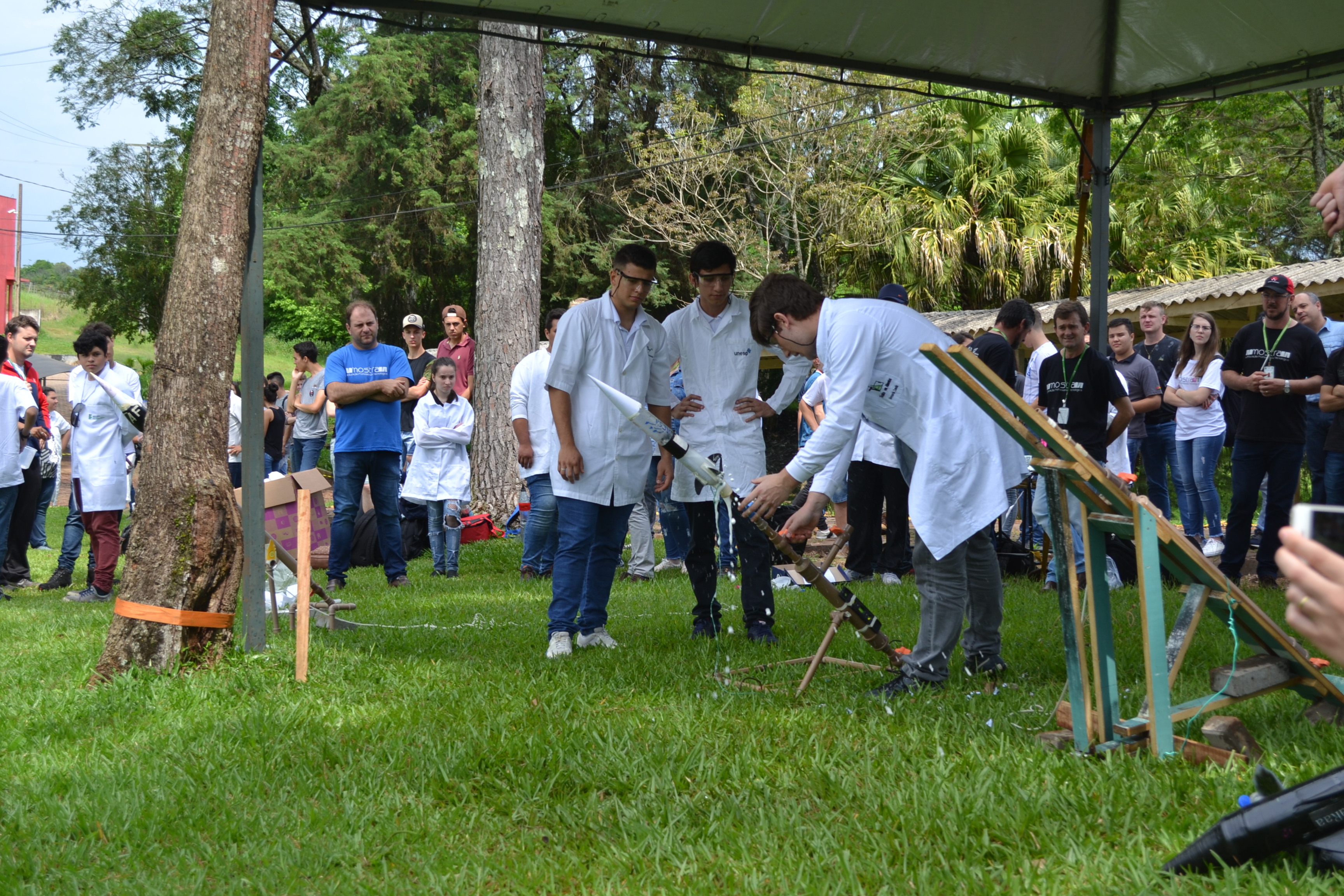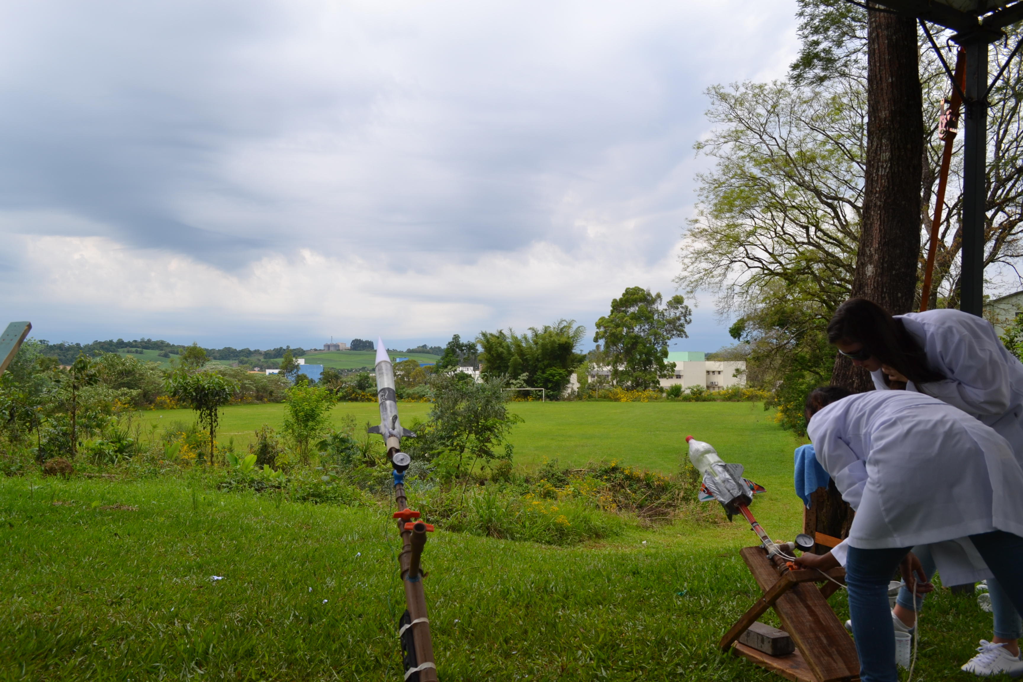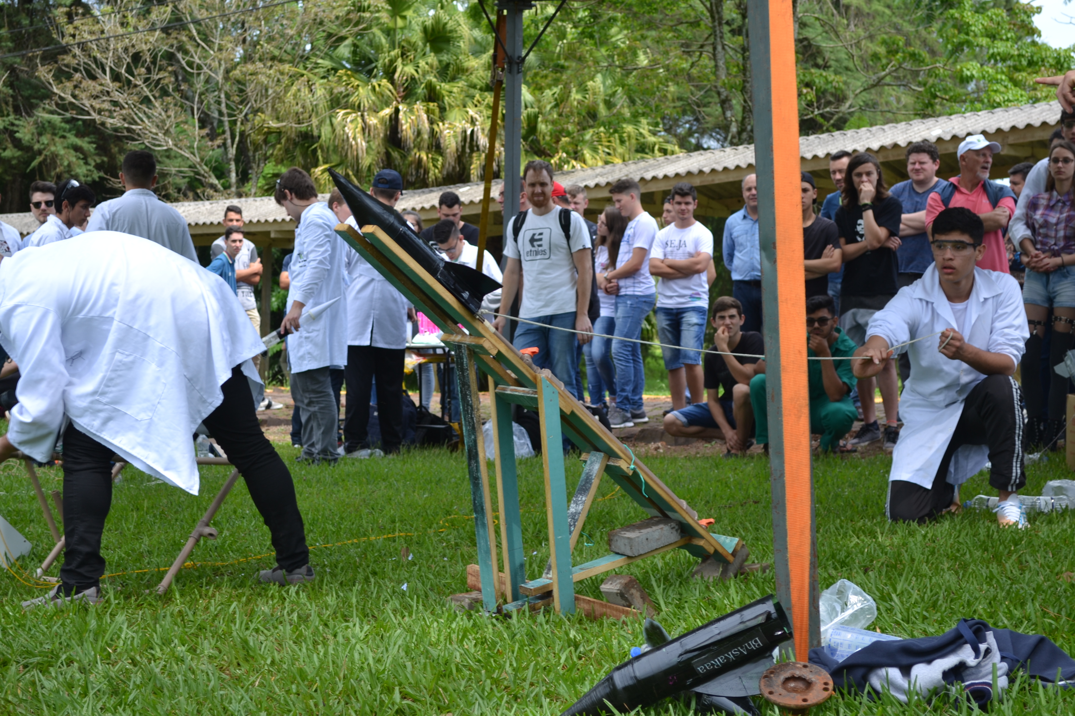 Foto: momento exato em que aluno aciona o disparador que desencadeia reação química que impulsiona o foguete