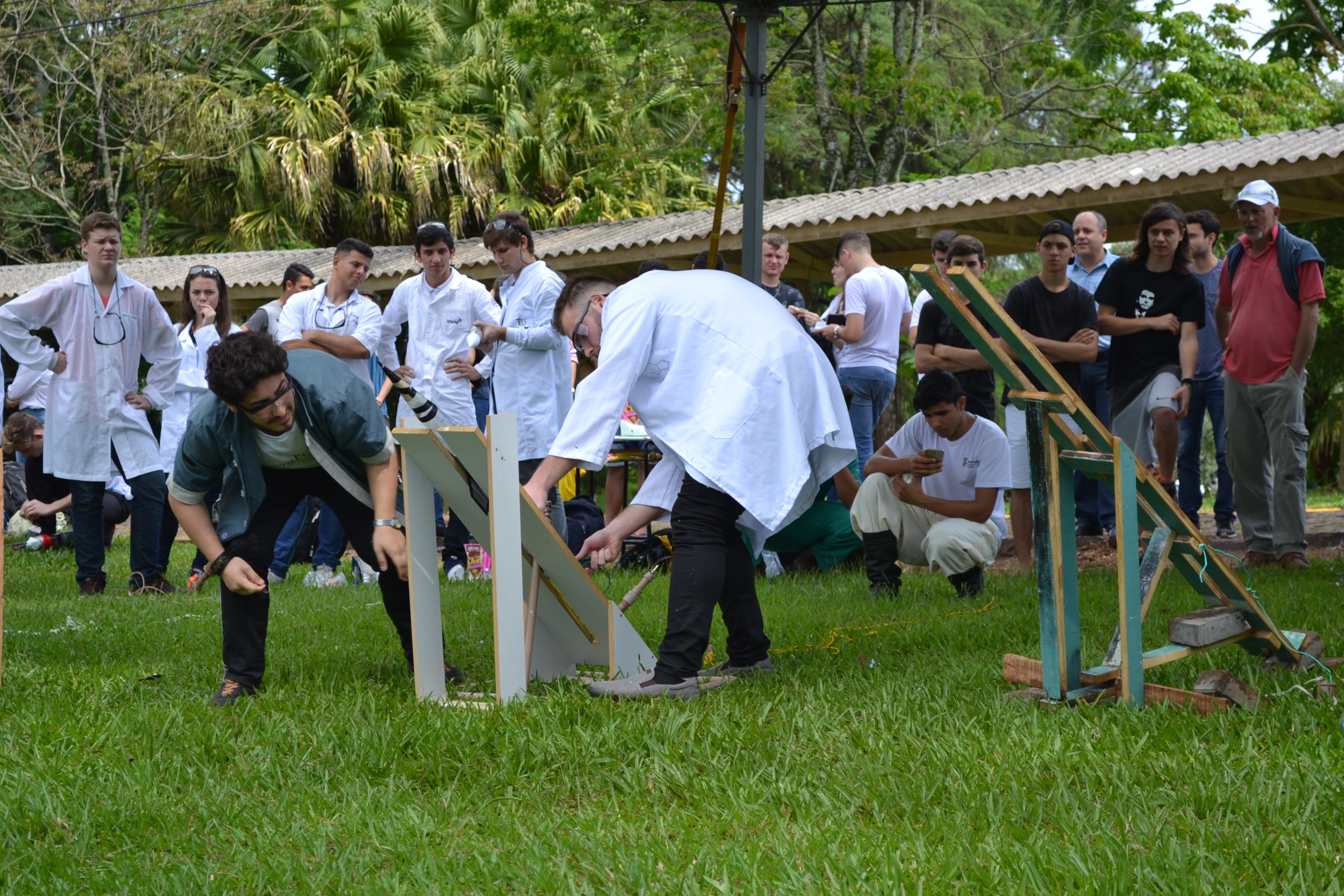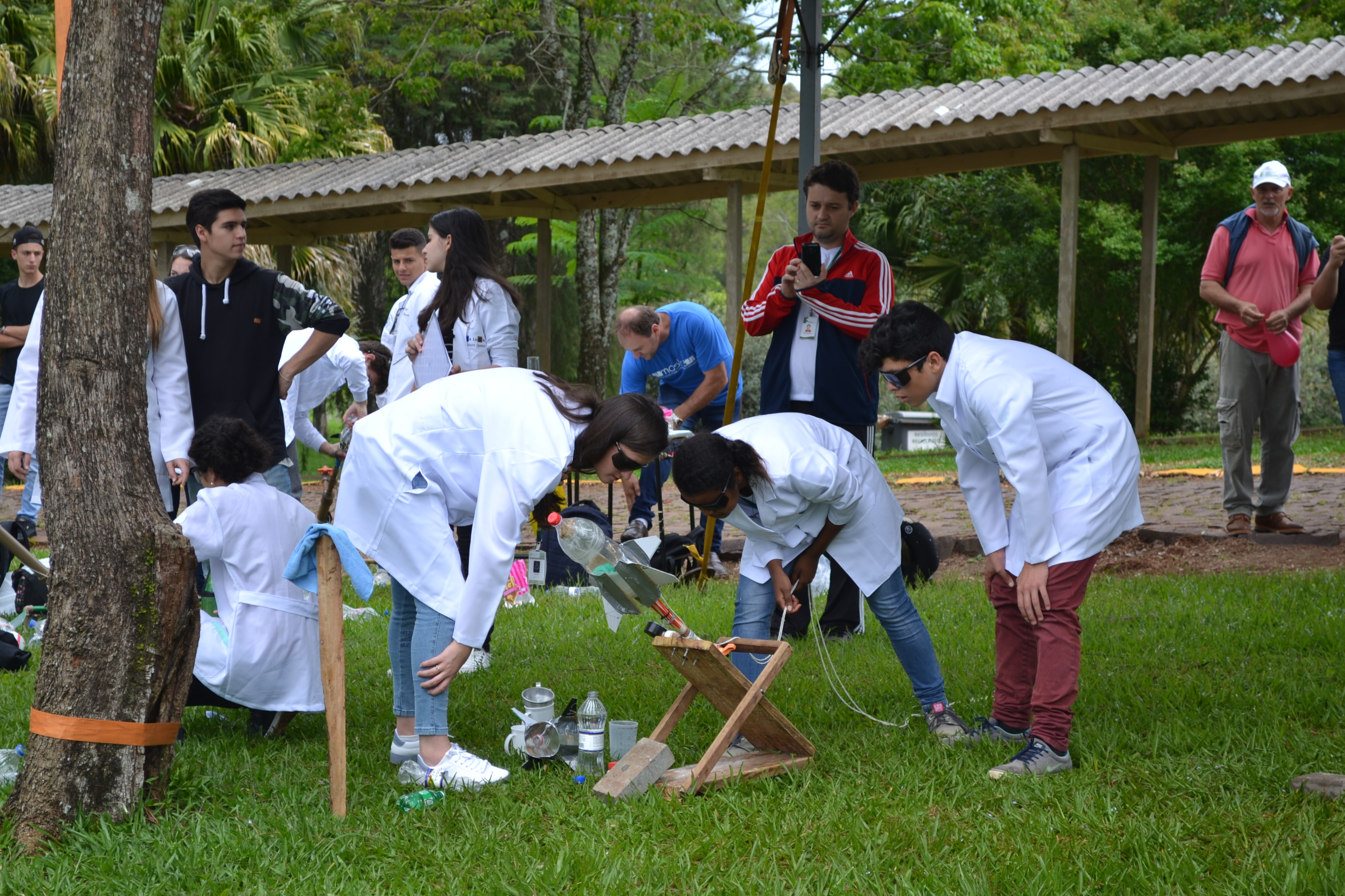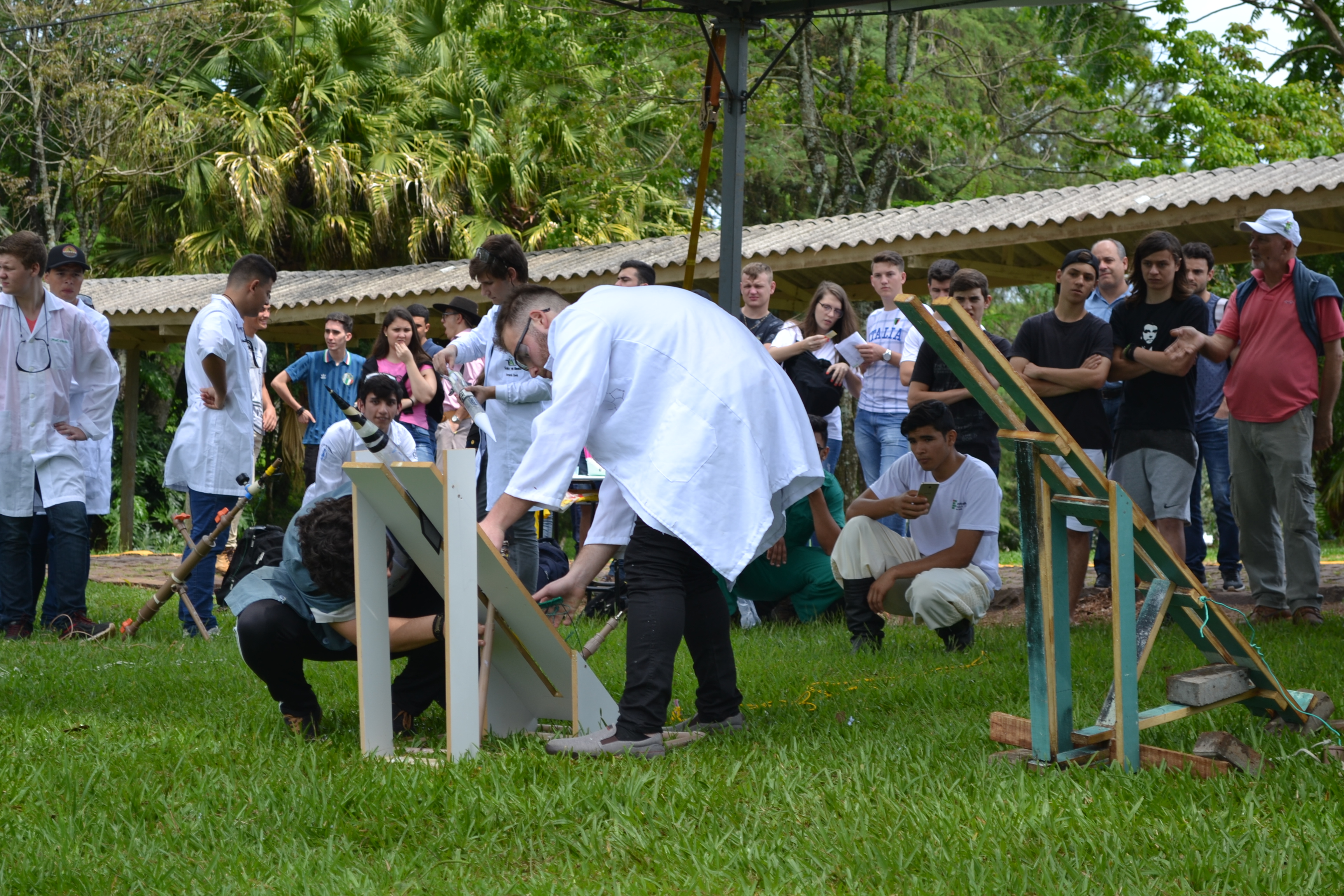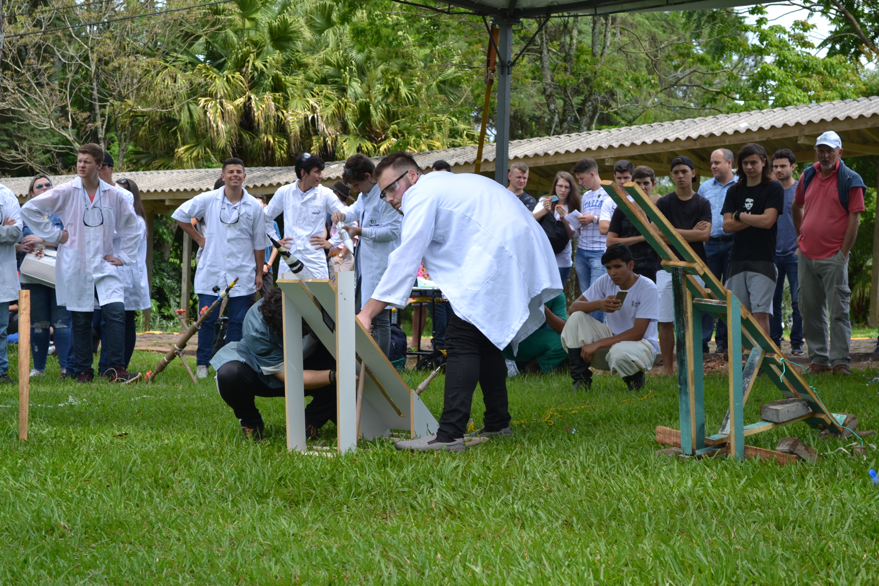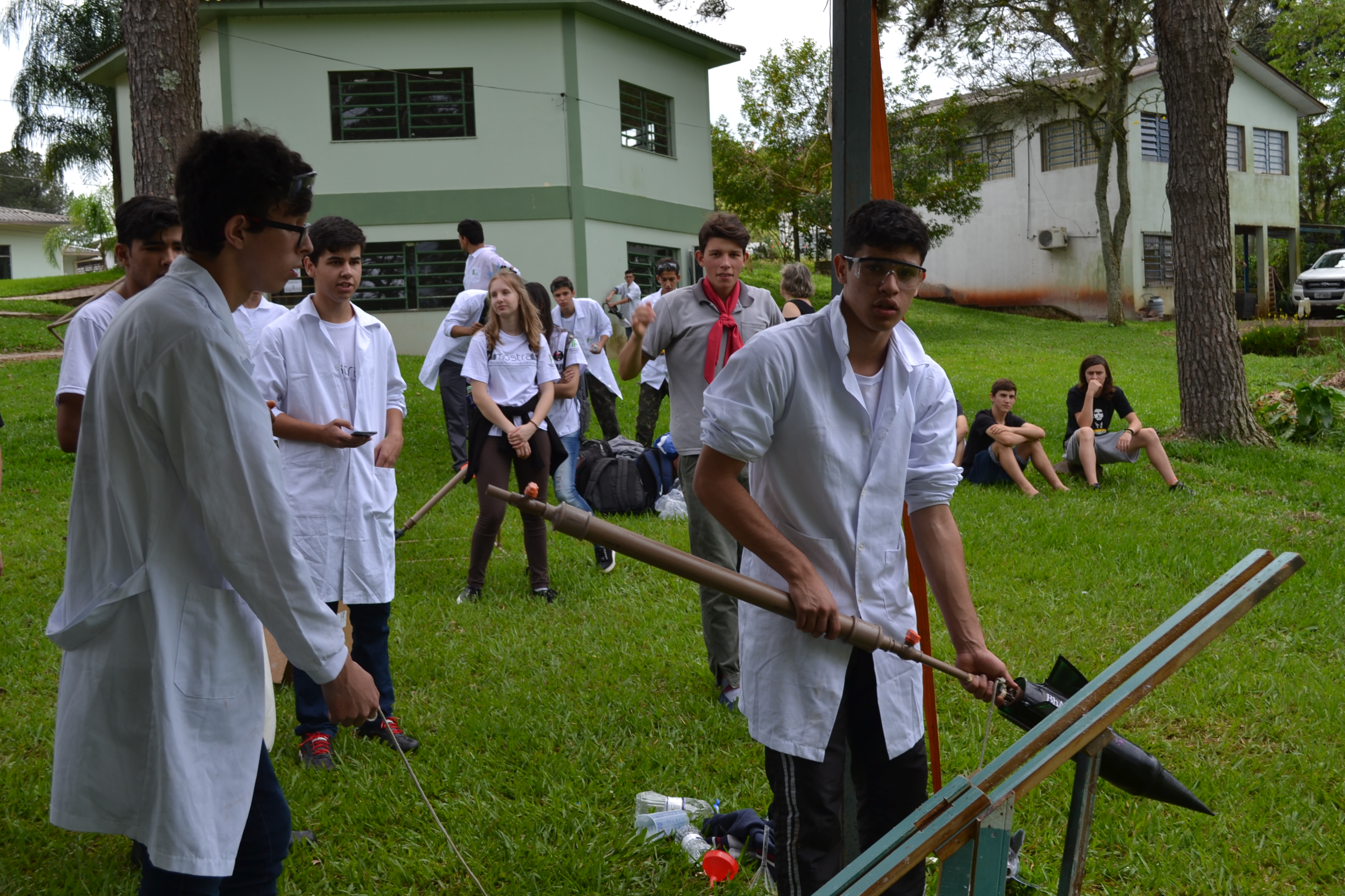 Foto: momento exato em que aluno aciona o disparador que desencadeia reação química que impulsiona o foguete
