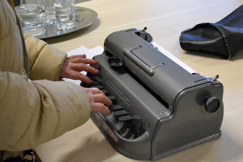 Foto: a professora Marli Schimitt demonstrou o funcionamento de uma máquina de escrever em Braille