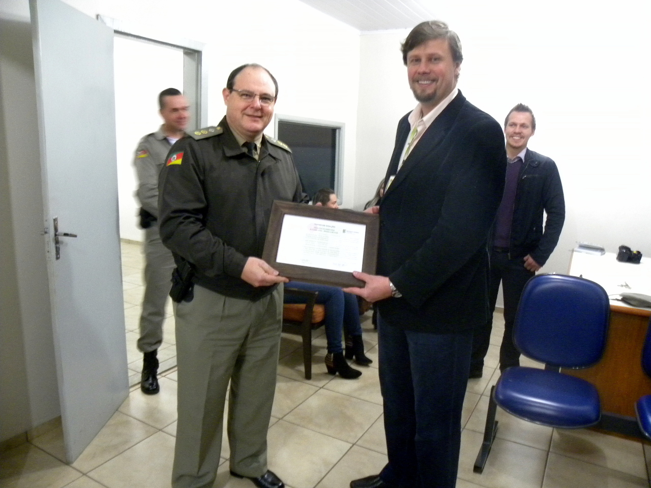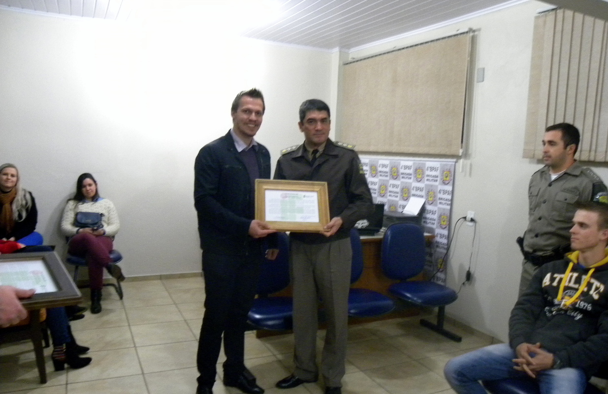 A entrega oficial dos trabalhos foi realizada na noite da sexta-feira (24), na sede do 4° Batalhão de Polícia de Área de Fronteira – BPAF. Os representantes da Brigada Militar receberam o Termo de Doação do mobiliário. O evento contou com a presença do diretor-geral do IF Farroupilha - Campus Santa Rosa, Marcelo Lamb; dos professores Lucas Tescke e Danieli Nejeliski; do laboratorista, Pedro Galina e dos alunos do 3° semestre do curso técnico em Móveis Subsequente.