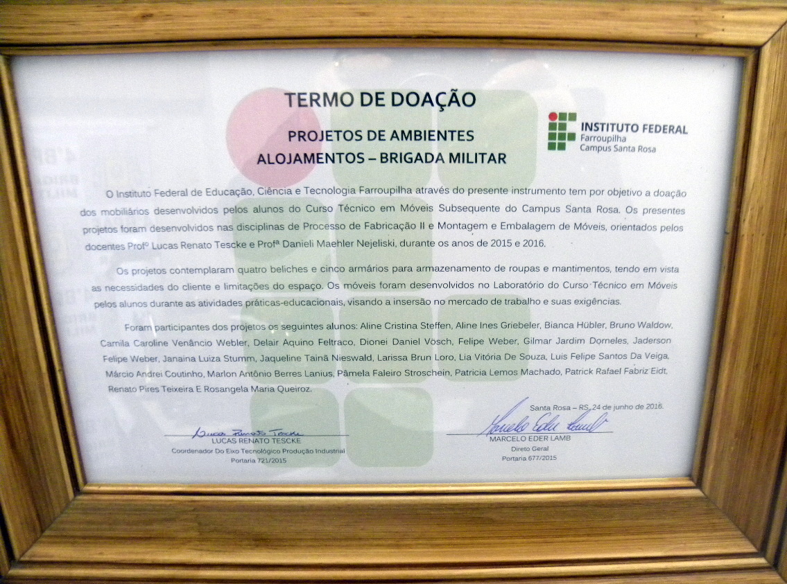 Os alunos do curso técnico em Móveis do IF Farroupilha - Campus Santa Rosa desenvolveram um projeto de remodelação dos alojamentos da Brigada Militar do município. O projeto, desenvolvido desde o último ano letivo, fez parte das disciplinas de Processo de Fabricação II e Embalagem de Móveis e teve o objetivo de promover a integração entre os alunos e a realidade do mercado de trabalho.