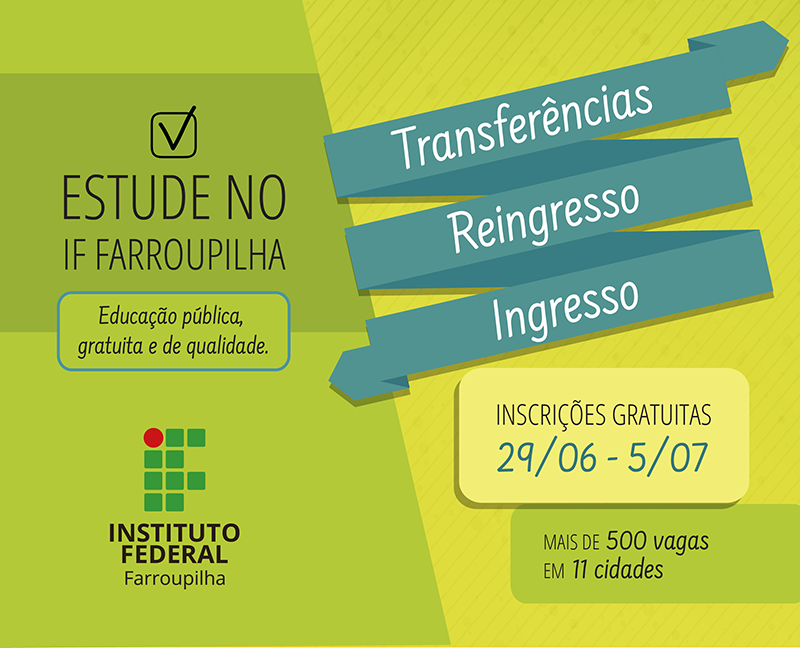Ex-alunos ou alunos do Instituto Federal Farroupilha que desejam mudar de cidade, estudantes de outras instituições, e interessados em conseguir um segundo diploma podem concorrer a mais de 500 vagas em cursos técnicos de nível médio e superiores. As inscrições vão de amanhã (29) até 5 de julho.