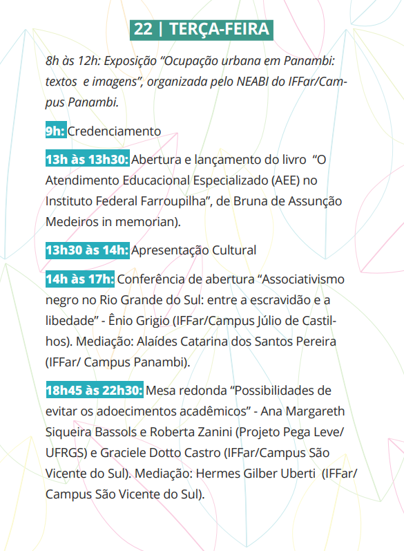 A programação inclui exposições, lançamento de livros, palestras e mesas redondas que perpassam temas como associativismo negro no RS, deficiências e mundo do trabalho, formas de evitar adoecimentos acadêmicos e mediação de conflitos nas escolas.