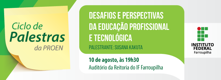 A palestra sobre Educação Profissional e Tecnológica vai ser ministrada pela presidente do Badesul Desenvolvimento - Agência de Fomento/RS, Susana Kakuta, no dia 10 de agosto, às 19h30 no Auditório da Reitoria do IF Farroupilha. A atividade faz parte do I Ciclo de Palestras para os Cursos de Tecnologia e Bacharelado, promovido pela Pró-reitoria de Ensino (Proen).