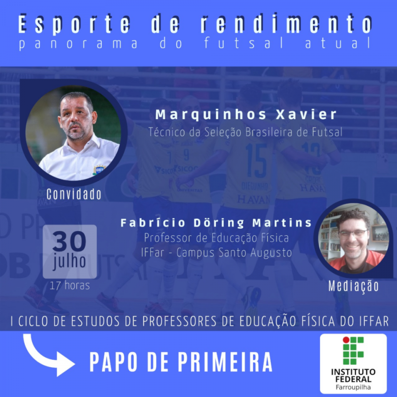 O I Ciclo de Estudos dos Professores de Educação Física do IFFar é um espaço de reflexão e formação através de conversas mensais com profissionais externos pela internet. A primeira atividade ocorre nesta quinta-feira (30), às 17h, e conta com a participação de Marquinhos Xavier, técnico da Seleção Brasileira de Futsal.