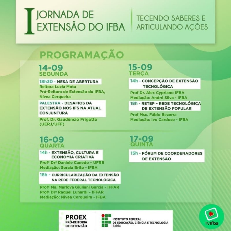 Nesta quarta-feira (16), as professoras Raquel Lunardi e Marlova Giuliani Garcia, da Pró-Reitoria de Extensão (PROEX), ministram a palestra “Curricularização da Extensão na Rede Federal” durante a I Jornada de Extensão Tecendo Saberes e Articulando Ações, do Instituto Federal da Bahia (IFBA).