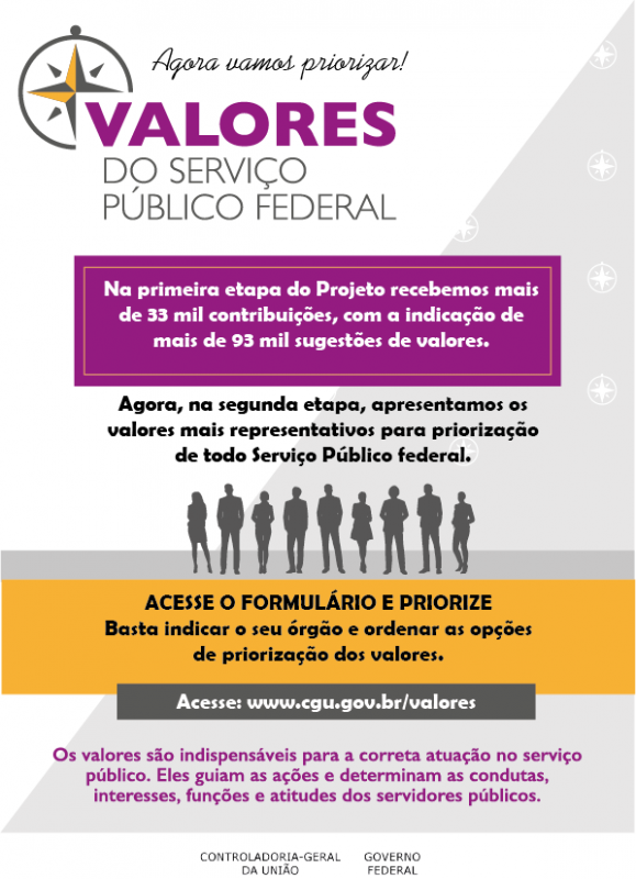A iniciativa busca compreender os conceitos dos valores existentes na Administração Pública para refletir sobre seu uso no desenvolvimento pessoal, nas rotinas de trabalho, nas competências comuns e no clima organizacional. A partir dos resultados coletados, serão desenvolvidas ações de promoção de tais valores.