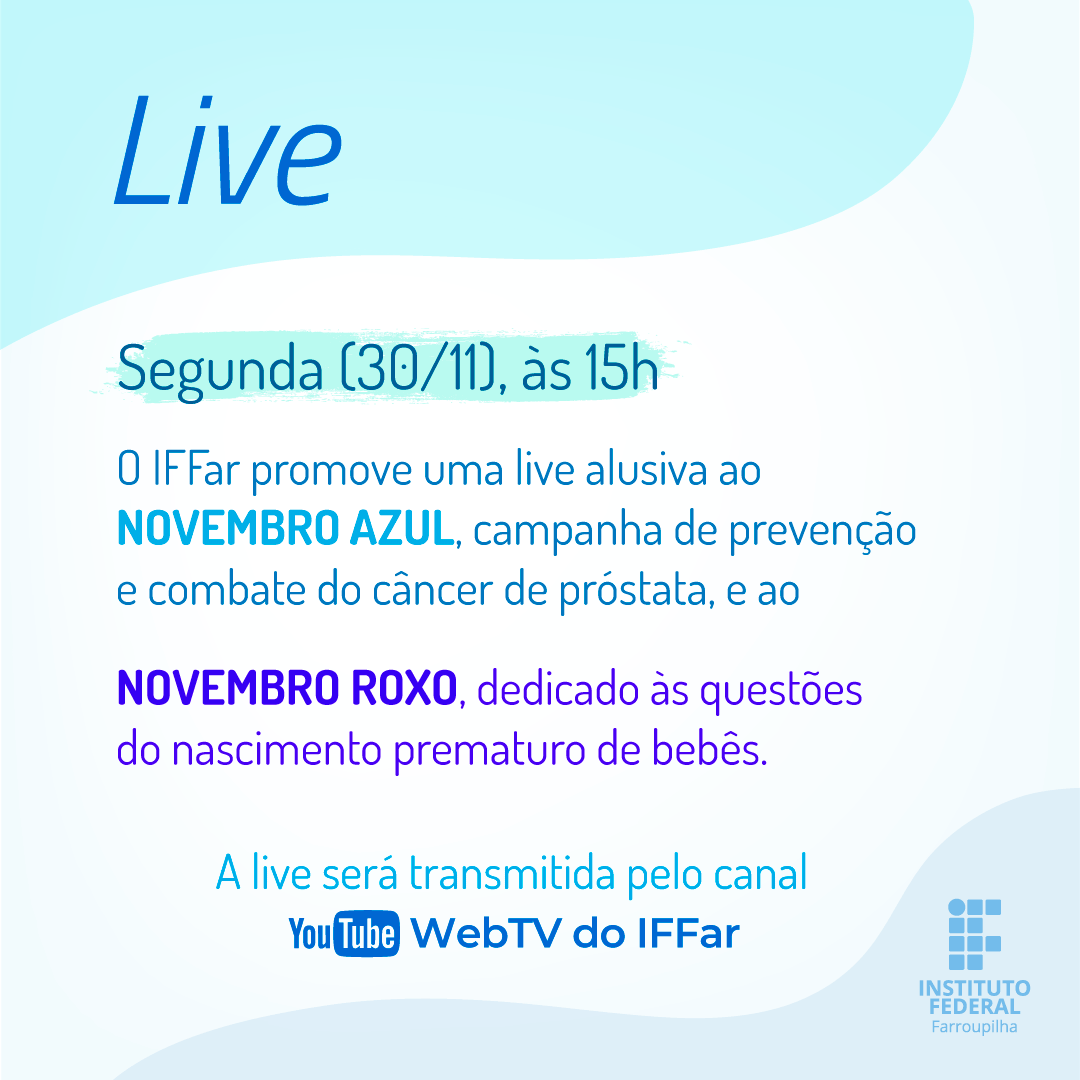 Nesta segunda-feira (30/11), às 15h, o IFFar vai promover uma live alusiva ao Novembro Azul, campanha de prevenção e combate ao câncer de próstata, e ao Novembro Roxo, dedicado às questões do nascimento prematuro de bebês.