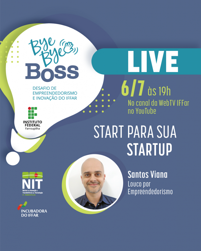 Nesta terça-feira (6), a partir das 19h, o IFFar realiza a live "START para sua STARTUP", com Santos Viana (Louco por Empreendorismo). A transmissão será pelo canal da WebTV no YouTube. A atividade é aberta ao público e faz parte da primeira etapa do III Desafio de Empreendedorismo e Inovação do IFFar - Bye Bye Boss 2021, que conta com mais uma palestra no dia 14.