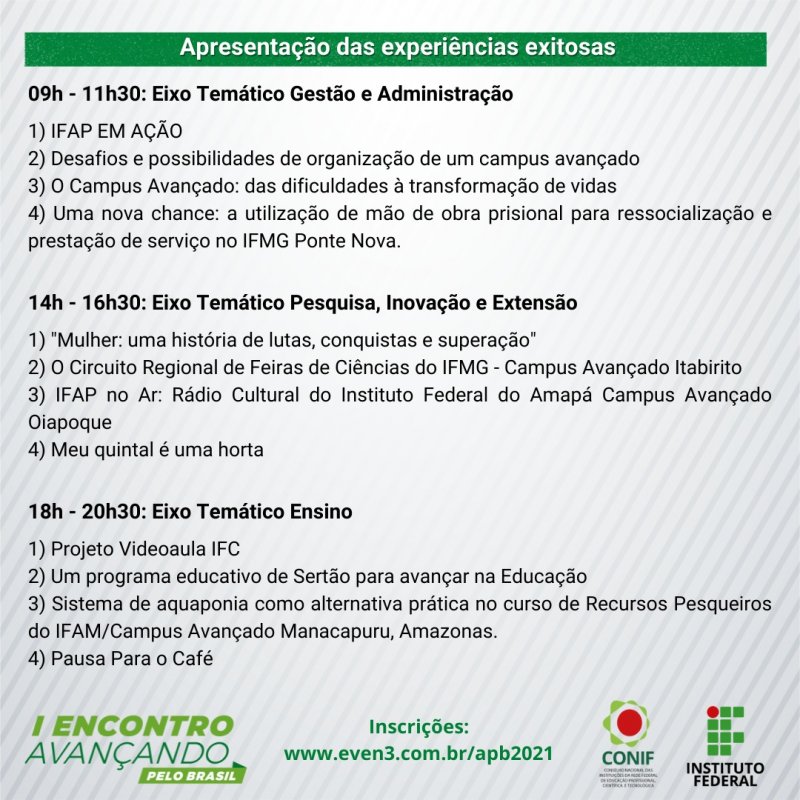 O 'Avançando pelo Brasil" foi idealizado por diretores de campi avançados, contando com a participação e apoio de reitores, pró-reitores e do Conselho Nacional das Instituições da Rede Federal de Educação Profissional, Científica e Tecnológica (CONIF), em especial da Câmara e do seu Fórum de Desenvolvimento Institucional. Saiba mais na página do evento no Instagram.
