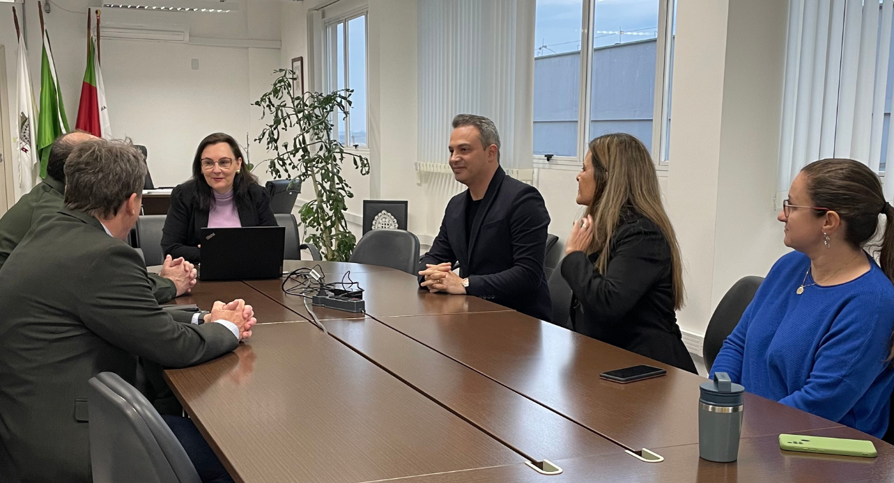 Foto: no centro, reitora do IFFar Nídia Heringer. À direita: Diretor de Extensão, Alcionir Pazatto Almeida; Coordenadora de Extensão Tecnológica, Ana Carla dos Santos Gomes; Diretora de Educação a Distância, Raquel Lunardi. À esquerda: General Sérgio Luiz Tratz e Coronel André Portela Batista, da 3ª Divisão do Exército.