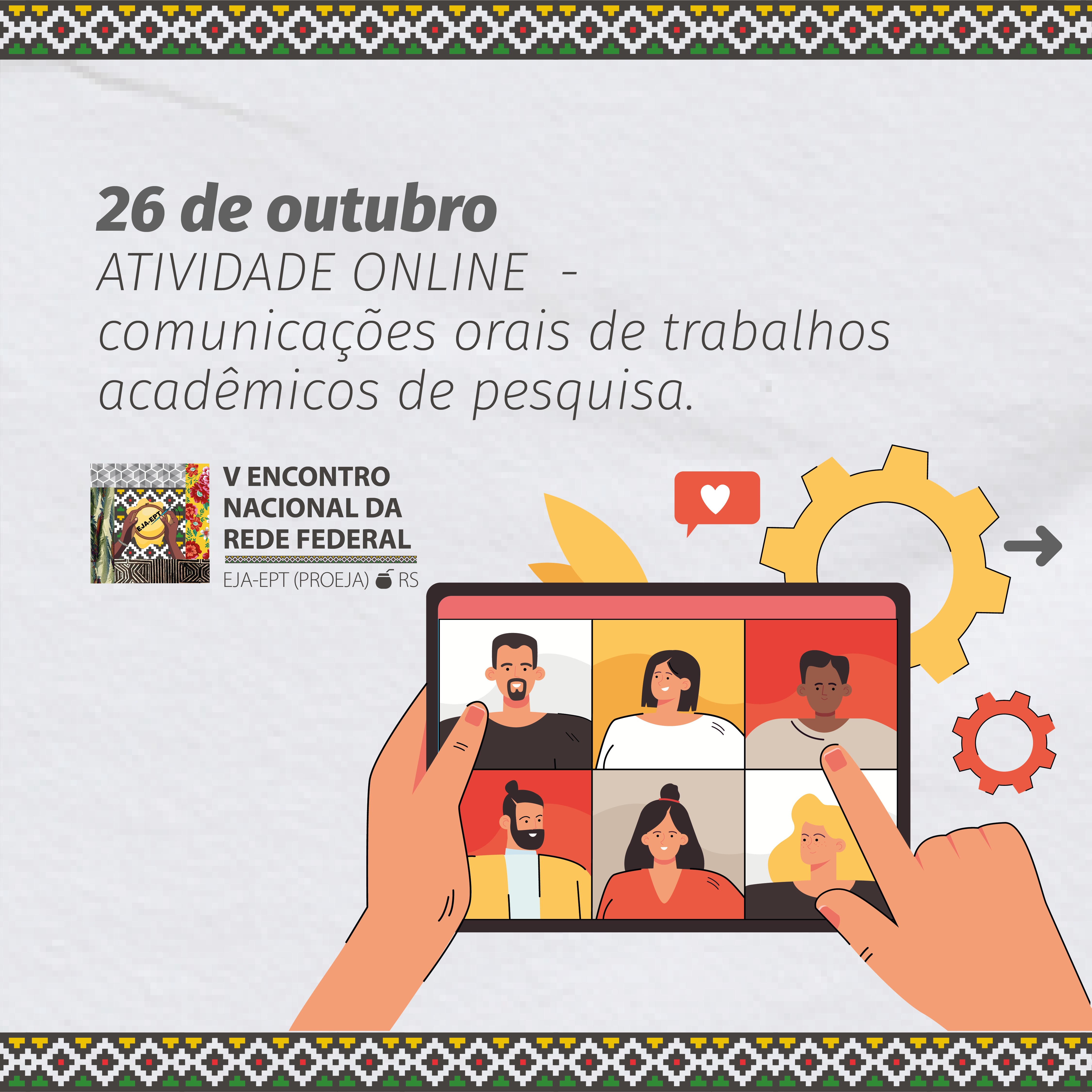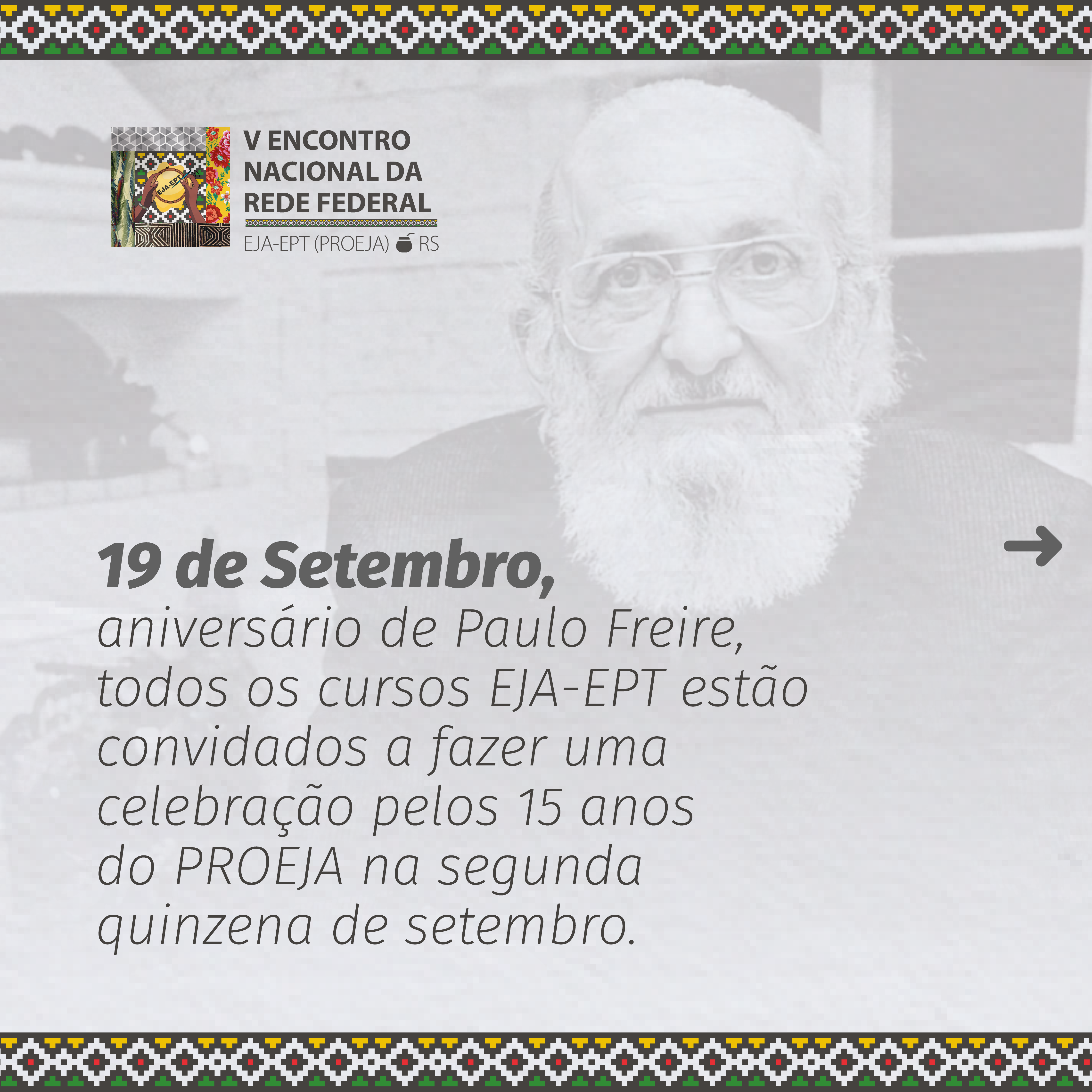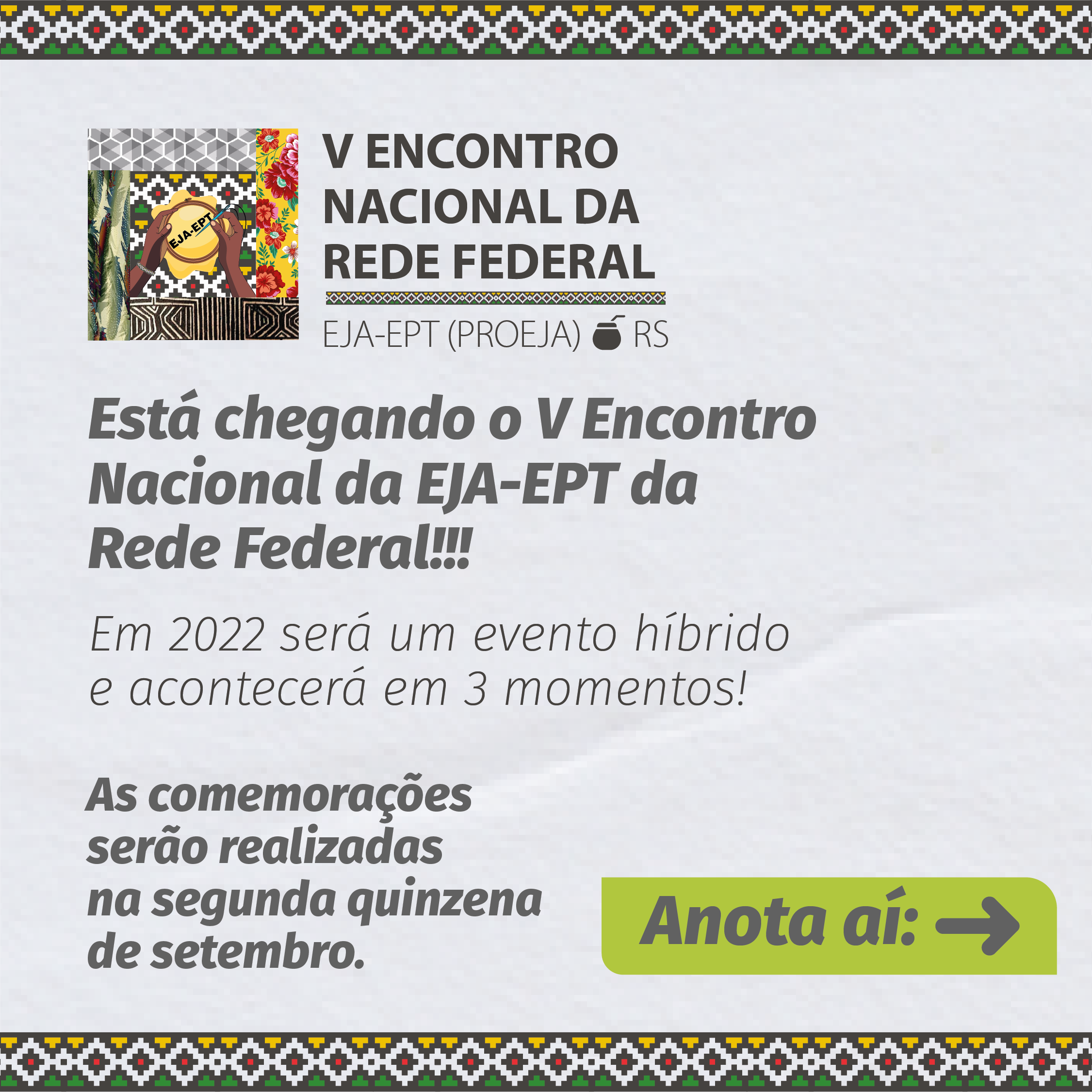 Estão abertas as inscrições para o V Encontro Nacional EJA-EPT (PROEJA) da Rede Federal, que será realizado de 29 de novembro a 1º de dezembro, em Sapucaia do Sul. O tema será “15 anos da EJA-EPT: por uma política pública de fato e de direito”.