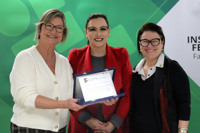 Foto: Carla Jardim recebe título de professora emérita. Da esq. para dir.: ex-reitora do IFFar, Carla Comerlato Jardim, atual reitora, Nídia Heringer e pró-reitora de Extensão, Angela Marinho