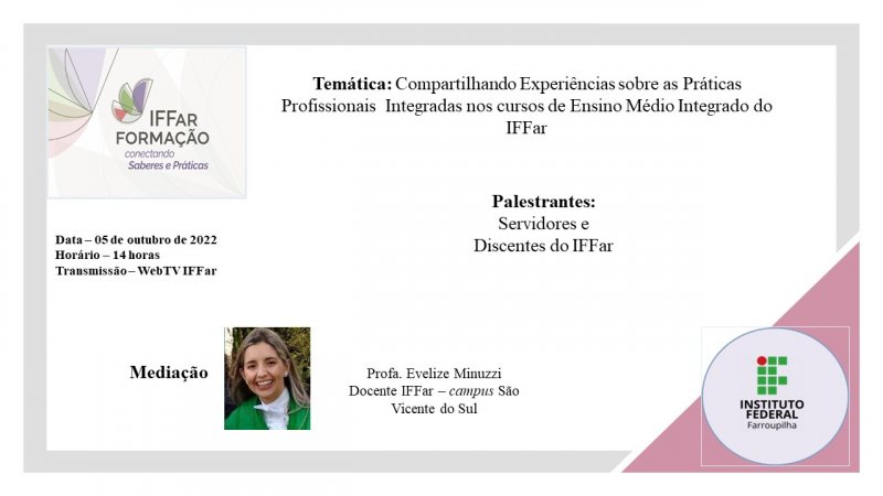 O IFFar formação será transmitido através do canal da WebTV do IFFar no Youtube. A conversa com servidores e alunos será mediada pela professora Evelize Minuzzi, do Campus São Vicente do Sul.
