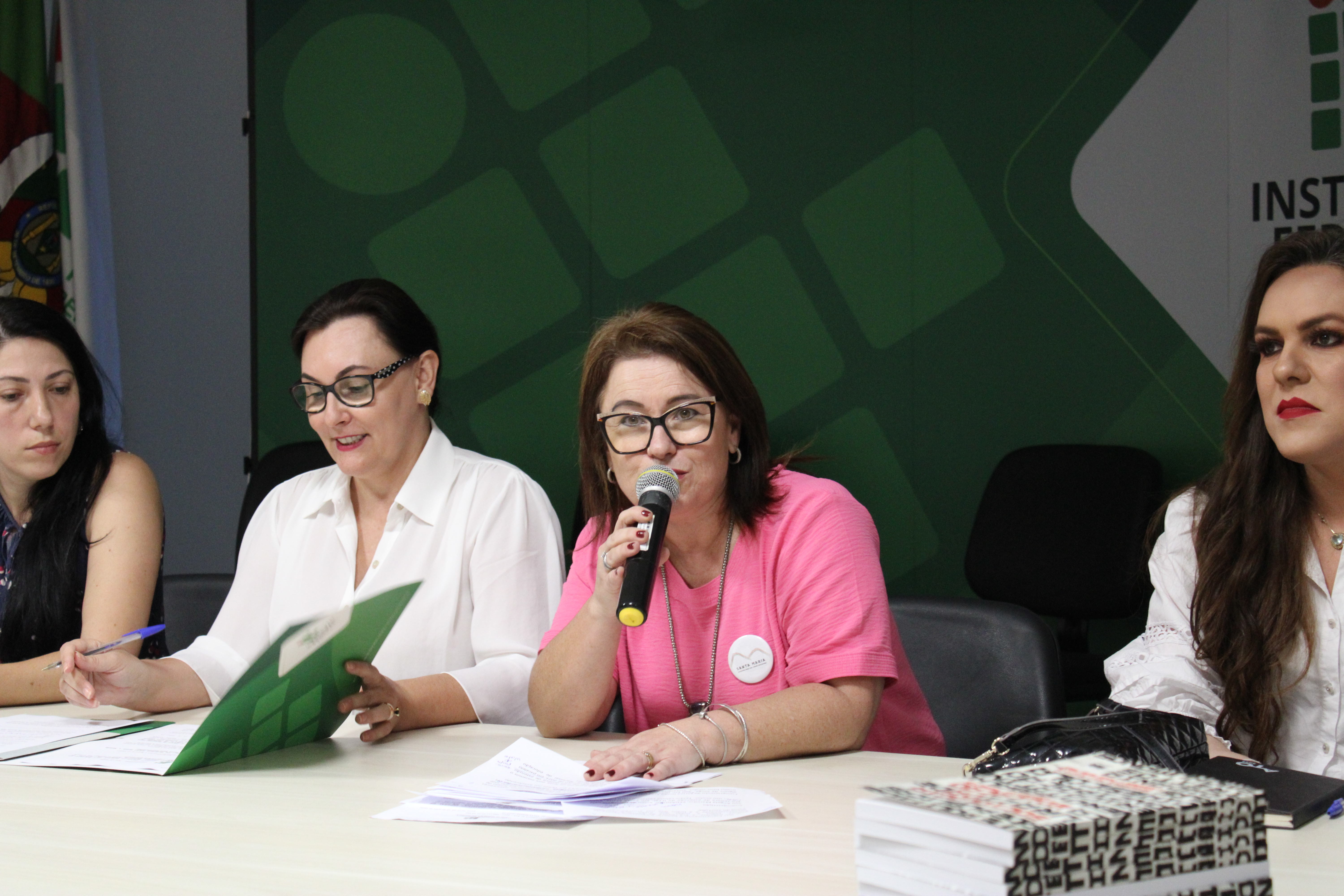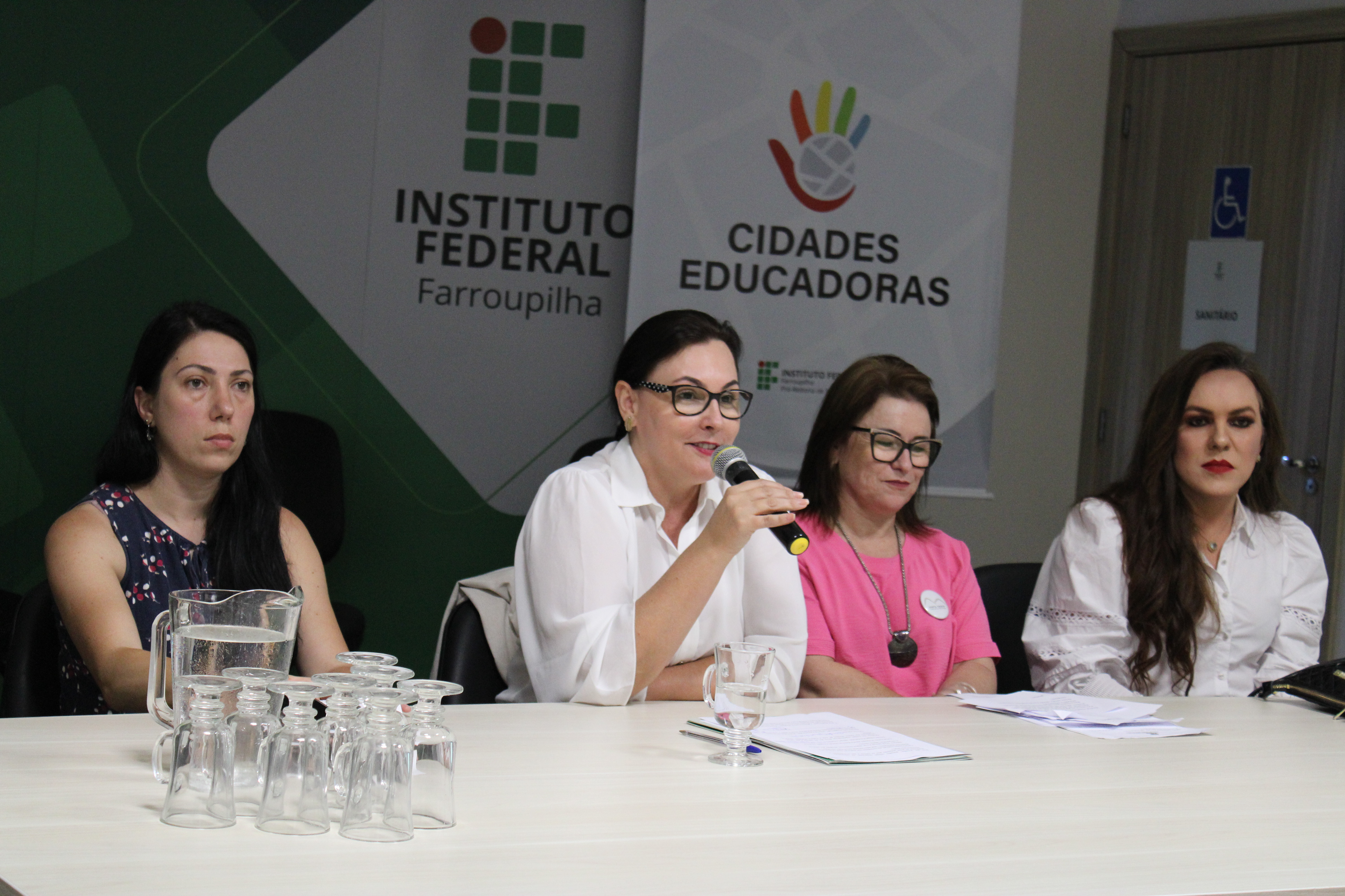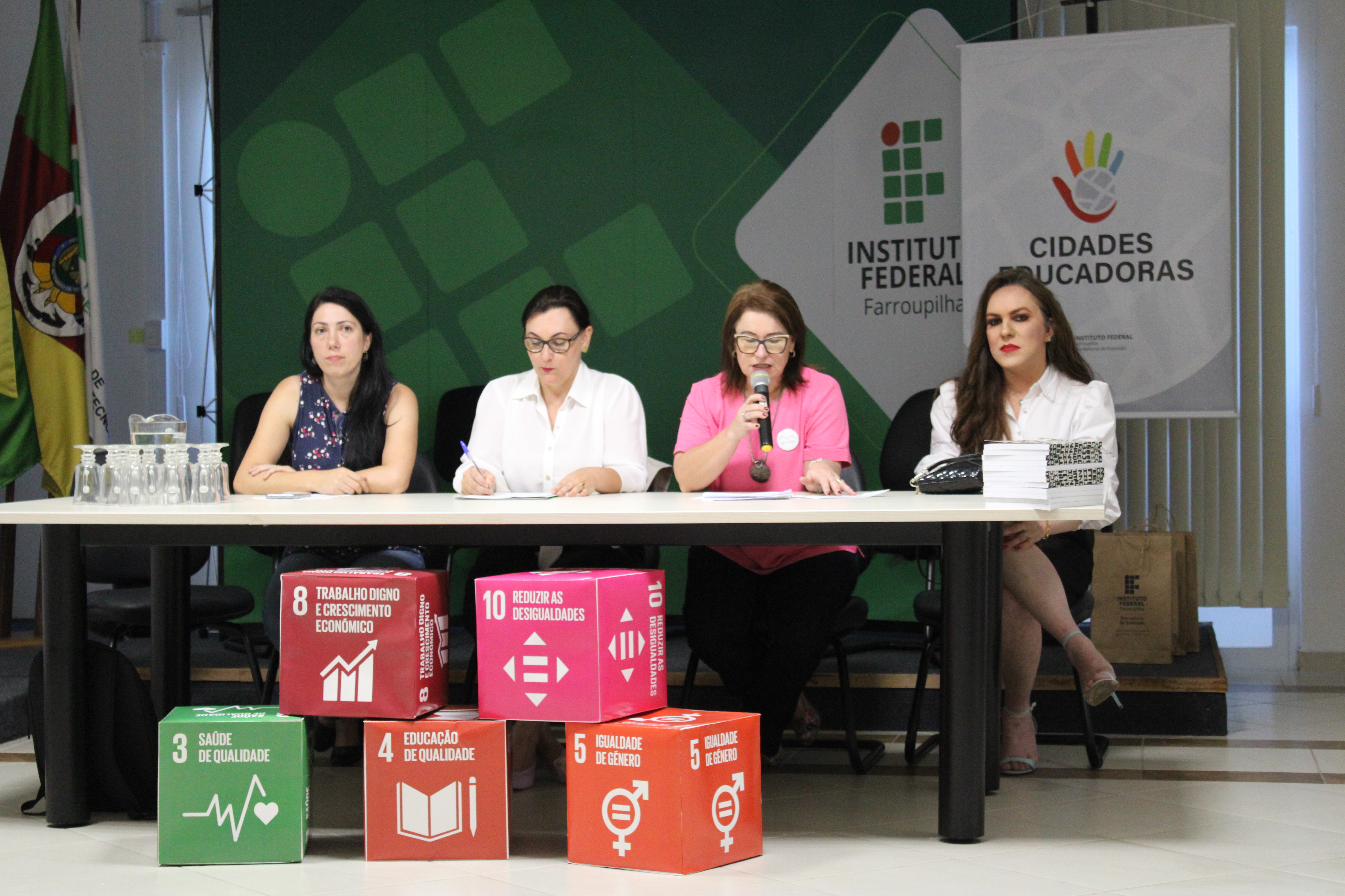 Foto: a mesa de abertura do evento foi composta pela pró-reitora de Ensino, Patrícia Donicht, pela reitora, Nídia Heringer, pela pró-reitora de Extensão, Ângela Marinho, e pela secretária adjunta de Cultura do Estado do RS, Gabriella Meindrad
