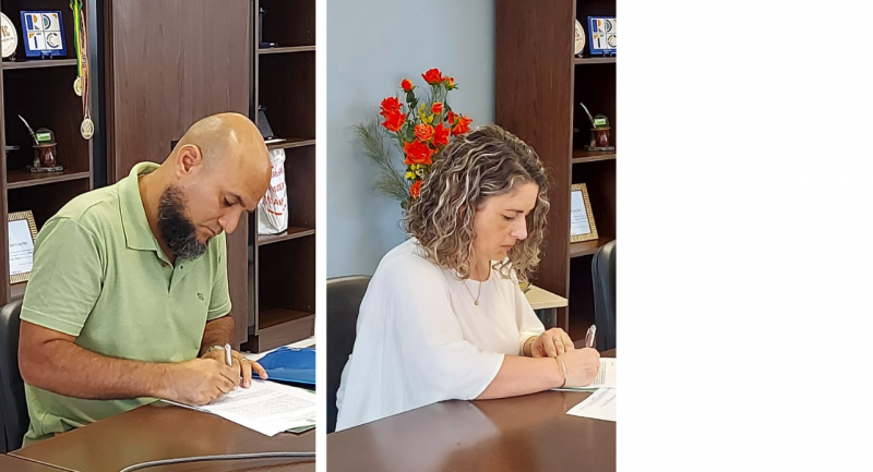 Foto: Ulisses dos Santos Gonçalves e Aline Silva Frota de Oliveira assinam termo de posse no Gabinete da Reitoria.