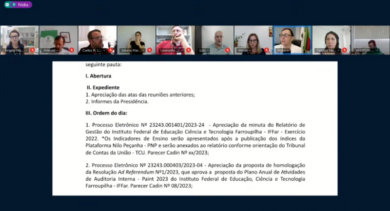 A aprovação da minuta do Relatório de Gestão 2022 foi a primeira pauta apreciada pelos conselheiros e conselheiras. Trata-se de uma prestação de contas anual publicada pelas instituições públicas, em atendimento ao artigo 70 da Constituição Federal e às exigências dos órgãos de controle. Assim, o documento sistematiza informações sobre recursos, processos e resultados institucionais, articulados às finalidades e competências do IFFar e também ao Plano de Desenvolvimento Institucional 2019-2026. A reitora do Instituto, Nídia Heringer, destacou que neste ano o prazo para publicação do relatório é 31 de março.