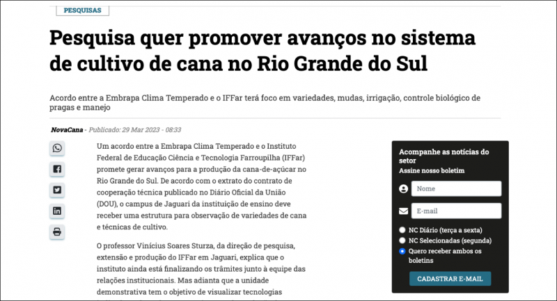 Um acordo entre a Embrapa Clima Temperado e o Instituto Federal de Educação Ciência e Tecnologia Farroupilha (IFFar) promete gerar avanços para a produção da cana-de-açúcar no Rio Grande do Sul. De acordo com o extrato do contrato de cooperação técnica publicado no Diário Oficial da União (DOU), o campus de Jaguari da instituição de ensino deve receber uma estrutura para observação de variedades de cana e técnicas de cultivo.