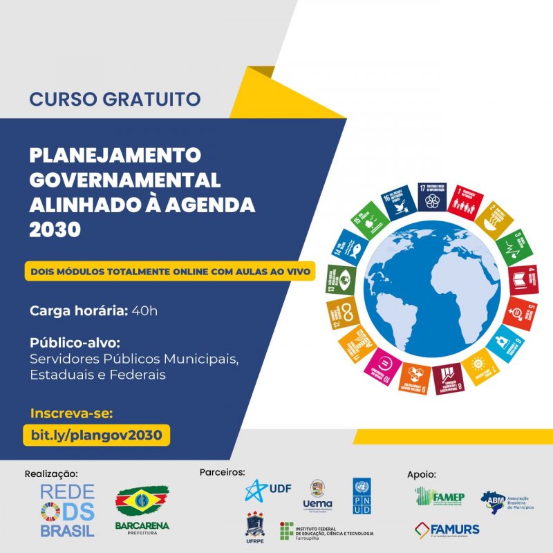 O Curso de Planejamento Governamental Alinhado à Agenda 2030 é promovido pela Rede ODS Brasil. O IFFar vai atuar em parceria juntamente com o Centro Universitário do Distrito Federal (UDF), a Universidade Estadual do Maranhão (UEMA), a Universidade Federal Rural de Pernambuco - UFRPE e o Programa das Nações Unidas para o Desenvolvimento (PNUD).