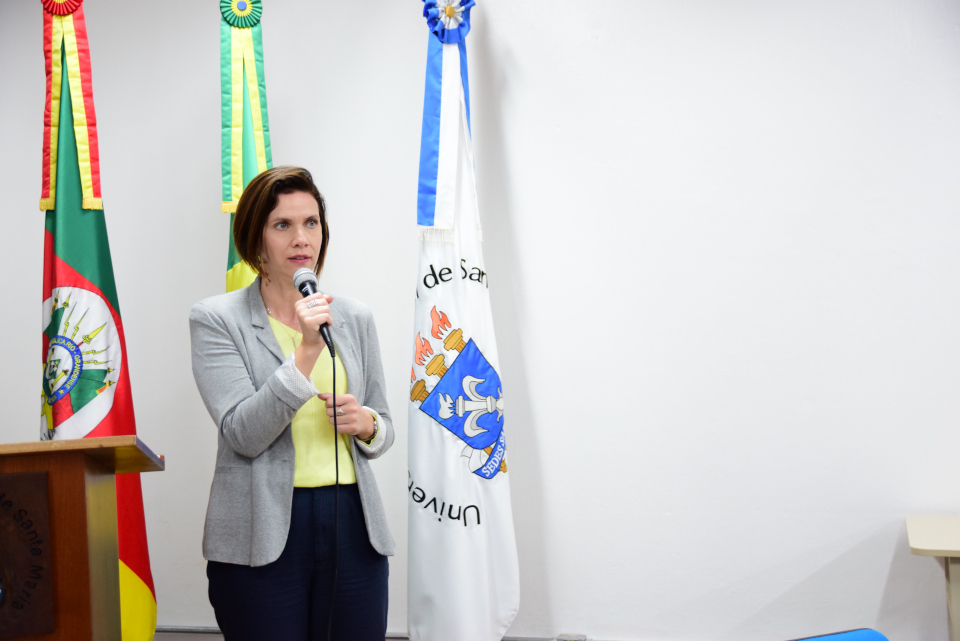 Jaciele Sell, coordenadora do projeto Aspirante Geoparque Quarta Colônia durante lançamento do doc Relatos e Retratos