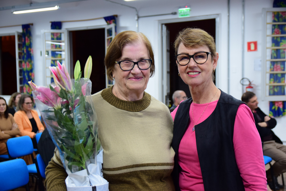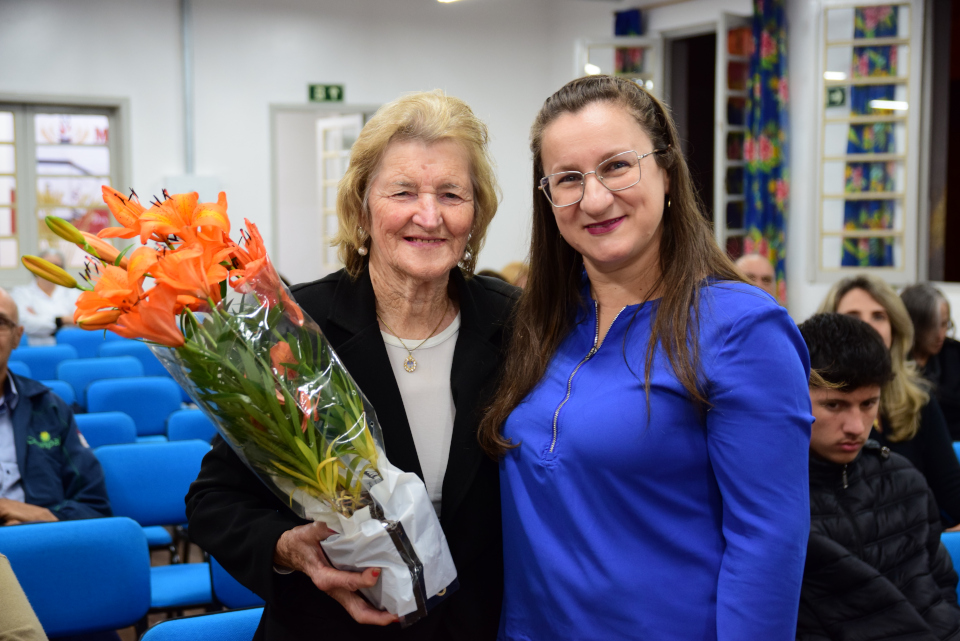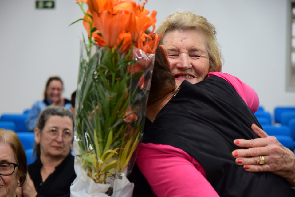 Dona Alzira recebe homenagem de Marina Frigo durante lançamento do doc Relatos e Retratos
