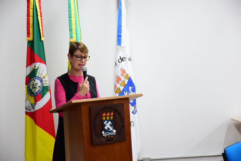 Foto: Raquel Lunardi, professora do IFFar, fala durante lançamento do documentário Relatos e Retratos em Silveira Martins