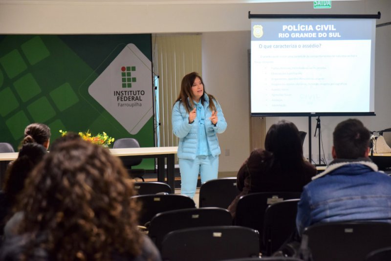Foto: delegada da Polícia Civil do Estado do RS ministra palestra para membros da Copsia do IFFar