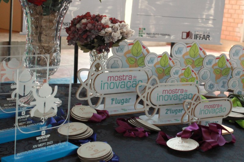 Foto: troféis e medalhas entregues aos trabalhos que se destacaram na XIV Mept