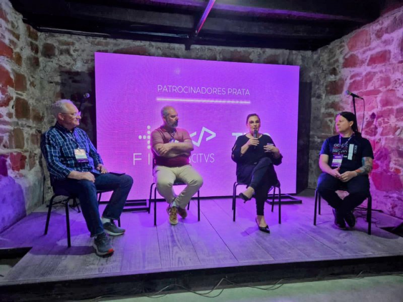 Foto: parte da programação do NIT Day 2023 ocorreu em paralelo ao Santa Summit, evento em que a reitora do IFFar (na foto com o microfone) foi uma das palestrantes