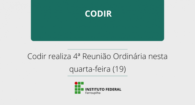 O Colégio de Dirigentes do IFFar (Codir) vai realizar sua 4ª Reunião Ordinária nesta quarta-feira (19), a partir das 9h, no Auditório da Reitoria do IFFar. O encontro também será transmitido pela WebTV do IFFar. Confira a pauta completa.