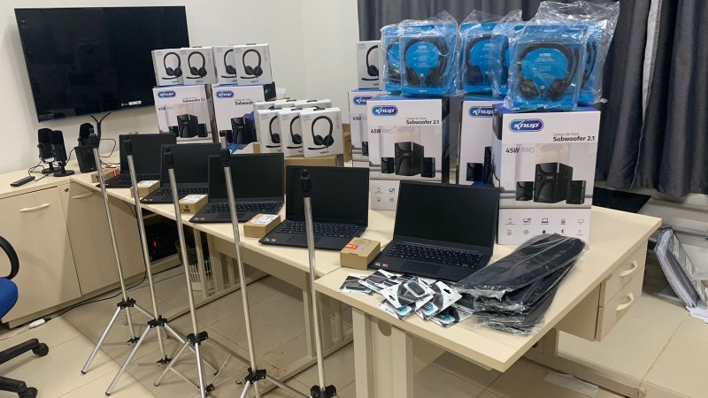 Ao todo, foram entregues seis notebooks de alto desempenho, três caixas de som com entrada para microfones, três porta banners, três discos rígidos, 16 fones de ouvido do tipo headset, nove pen-drives, nove webcams portáteis e seis apoios para teclado. O valor investido foi de R$40 mil.