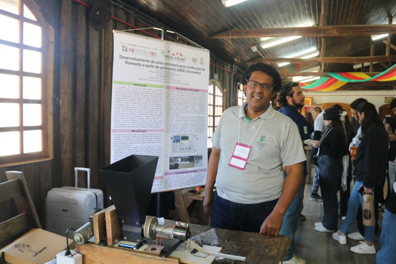 Foto: aluno do IFFar apresenta projeto "Desenvolvimento de uma extrusora para confecição de filamento a partir de polímeros reciclados" durante a XV Mept, em São Vicente do Sul