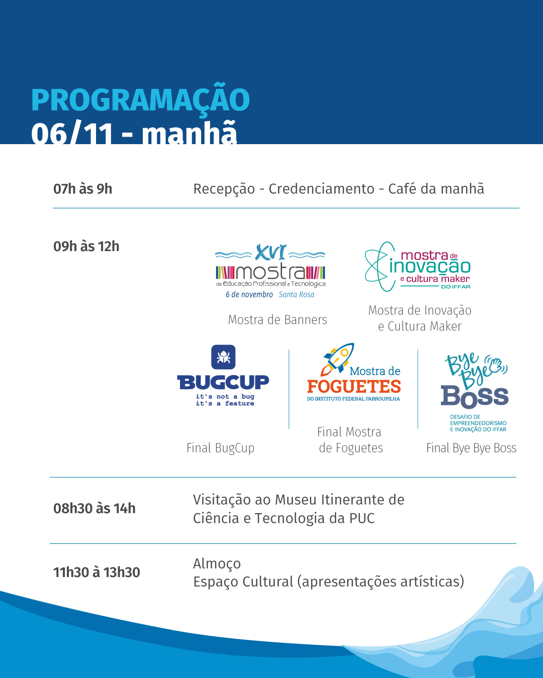Durante a manhã, a partir das 9h, a programação é composta pela apresentação de trabalhos principal em forma de pôsteres e quatro eventos paralelos: a Mostra de Inovação e Cultura Maker, a BugCup, o ByeByeBoss e a Mostra de Foguetes.