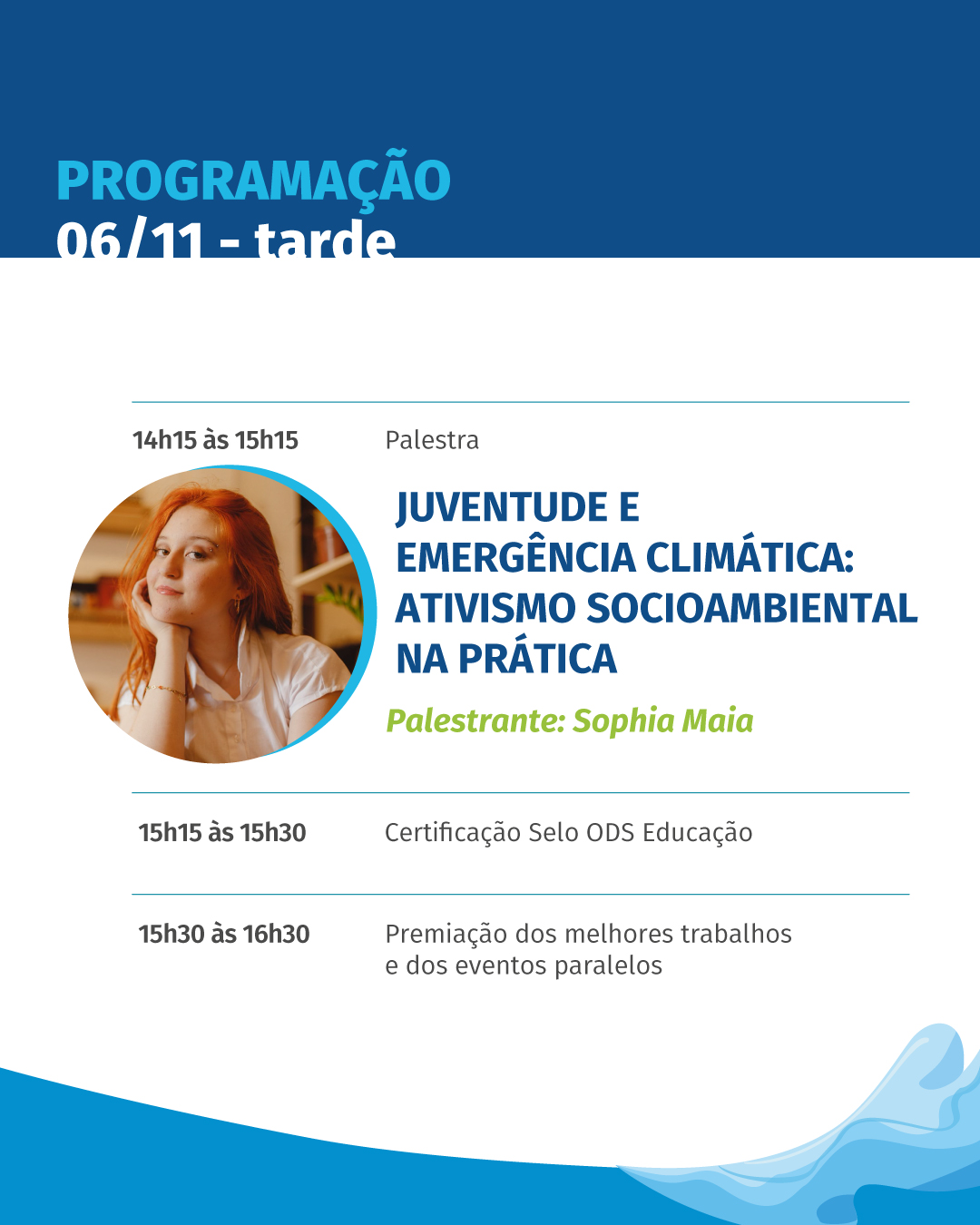 - 14h15 às 15h15: Palestra “Juventude e Emergência Climática: ativismo socioambiental na prática”. Palestrante: Sophia Maia