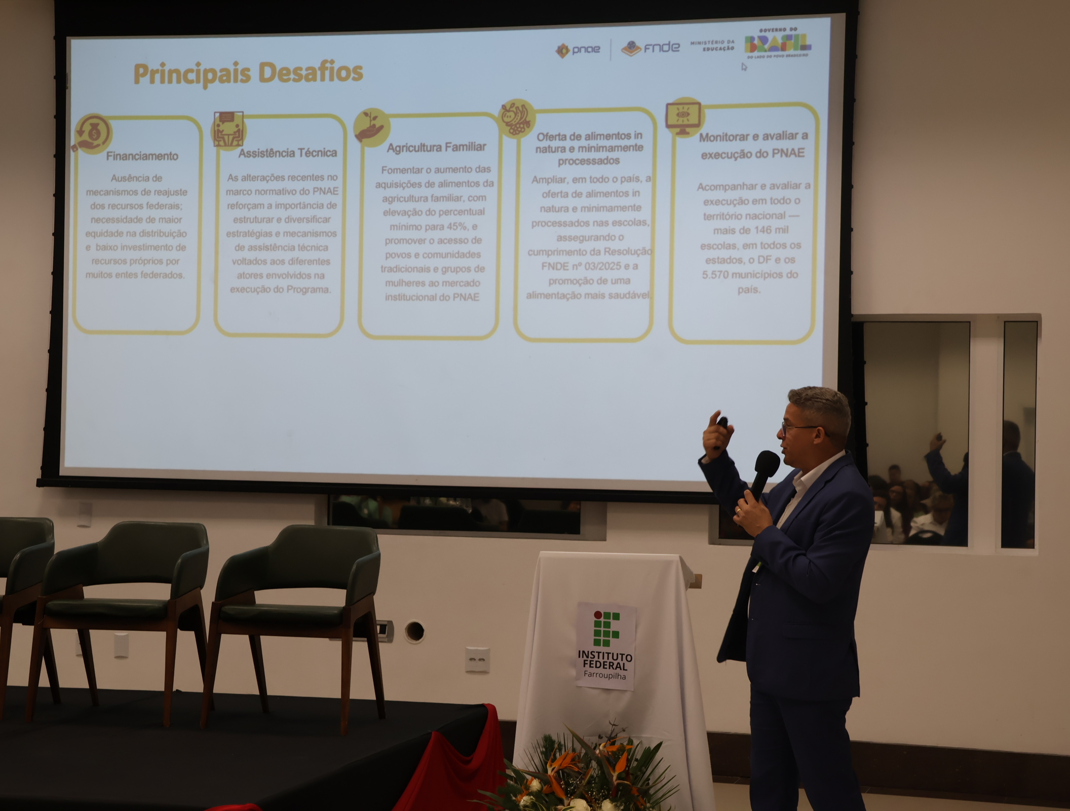 A apresentação contou com as participações de Nídia Heringer (CONIF), Amélia Borba Costa Reis (CFN), Amanda Machado Duarte (SETEC/MEC) e Valmo Xavier da Silva (FNDE). Entre os temas em pauta, foram detalhados os avanços a partir da lei do PNAE, o novo reajuste nos valores do programa e a expansão da infraestrutura estudantil, com a implantação de novos restaurantes na Rede Federal.