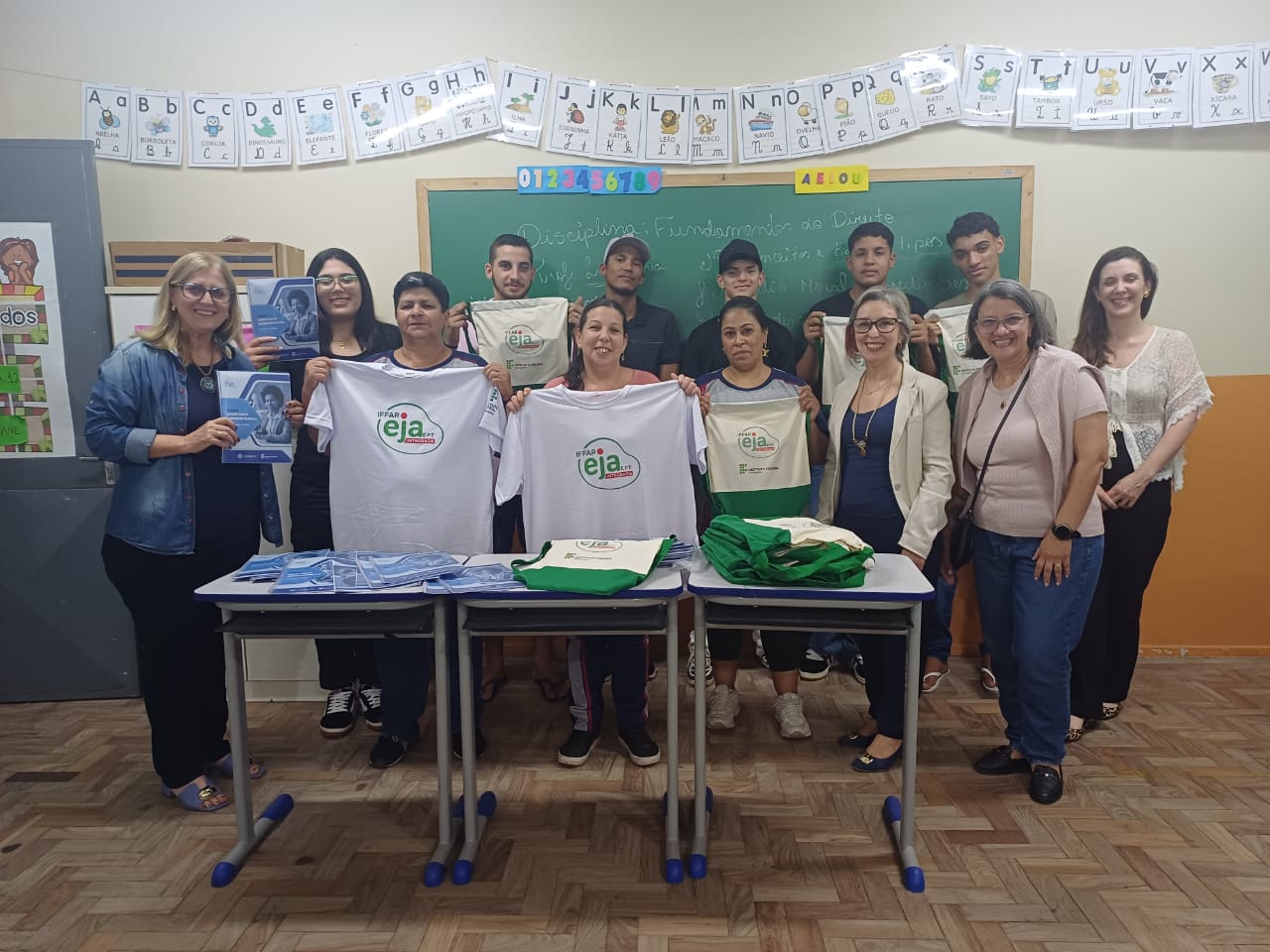 Foto: kit de materiais entregues a alunos de cursos EJA-EPT do IFFar inclui camisetas (Cleonice Graciano)